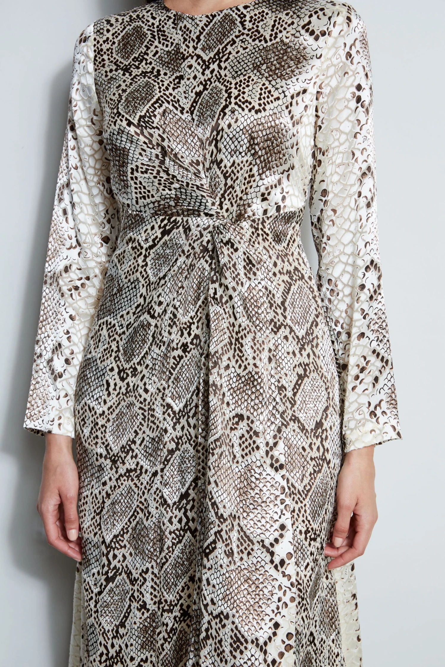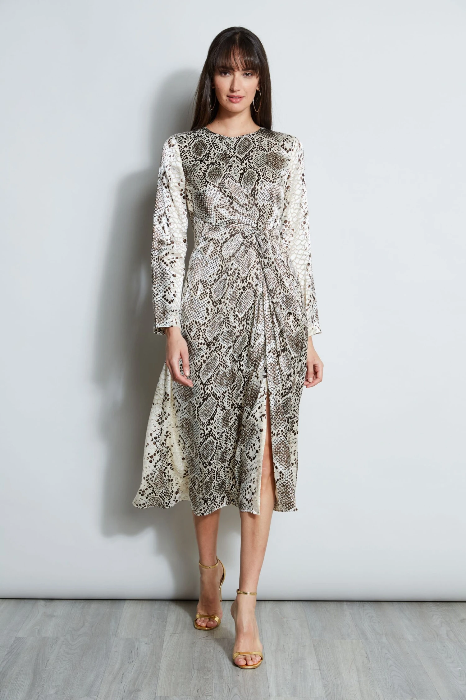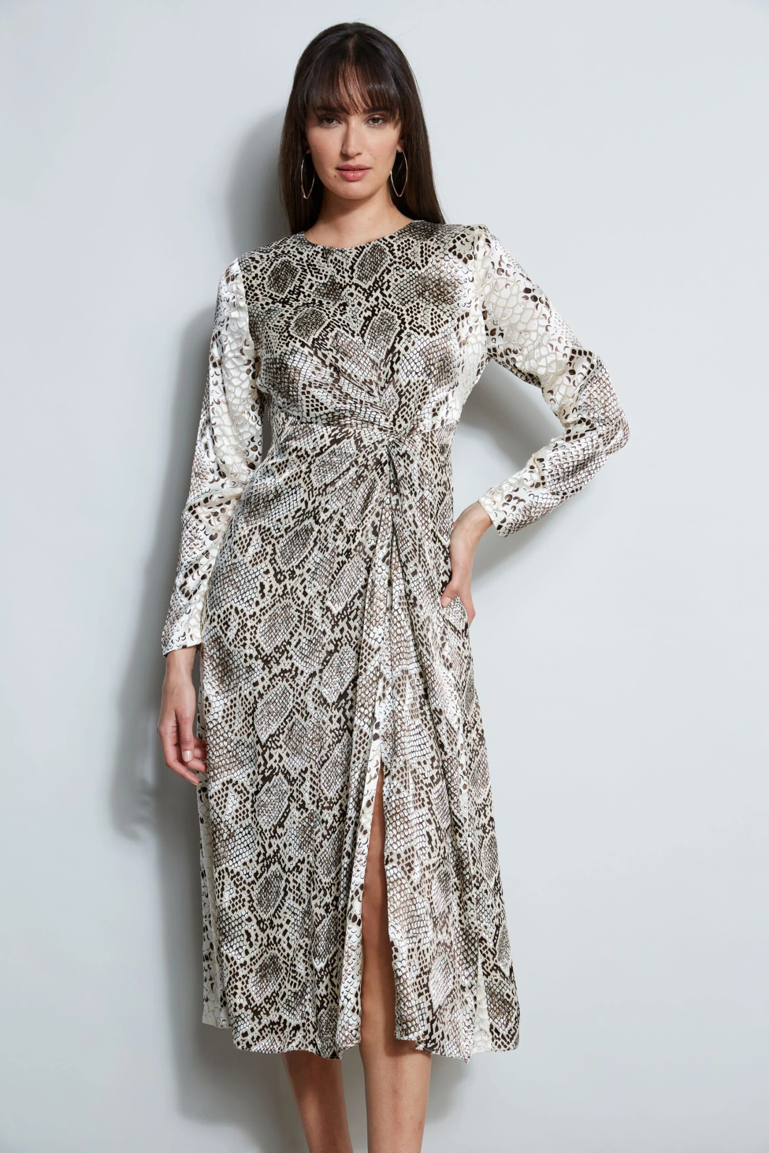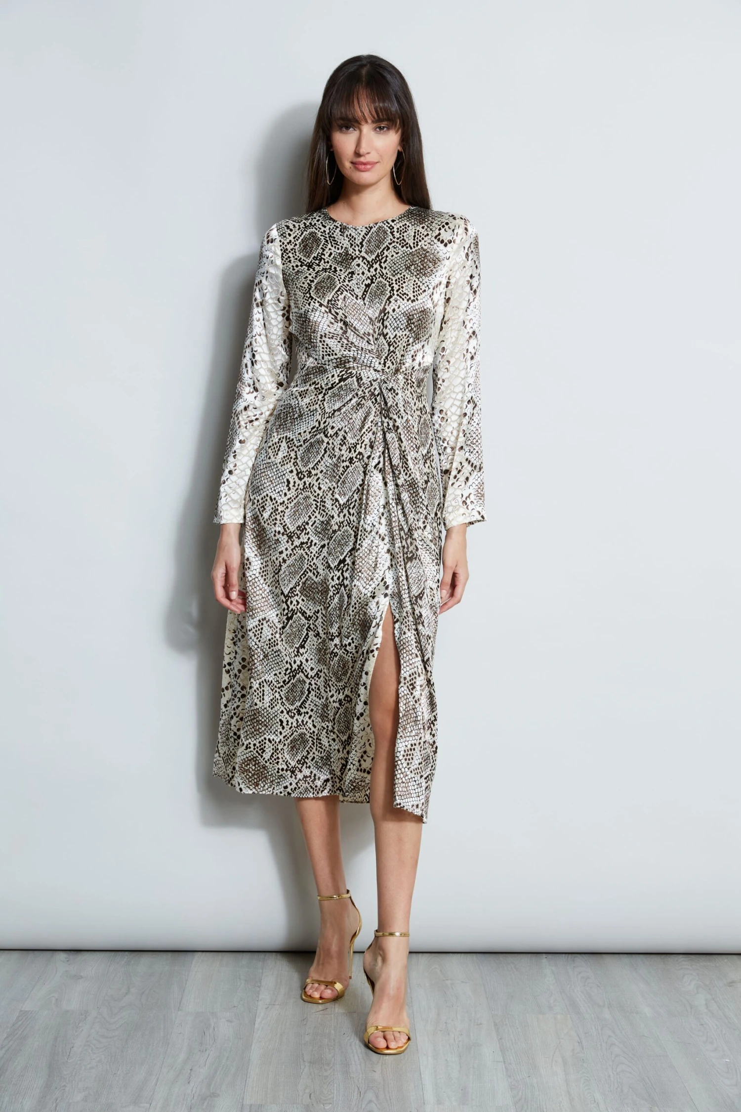 Chic & playful, the draped waist detail of our burnout Python Dress gives it an artistic edge. Designed with a jewel neckline, long sleeves & side slit, this dress speaks the language of Fall. Dress it down with flats or up with sexy sandals for a special occasion.