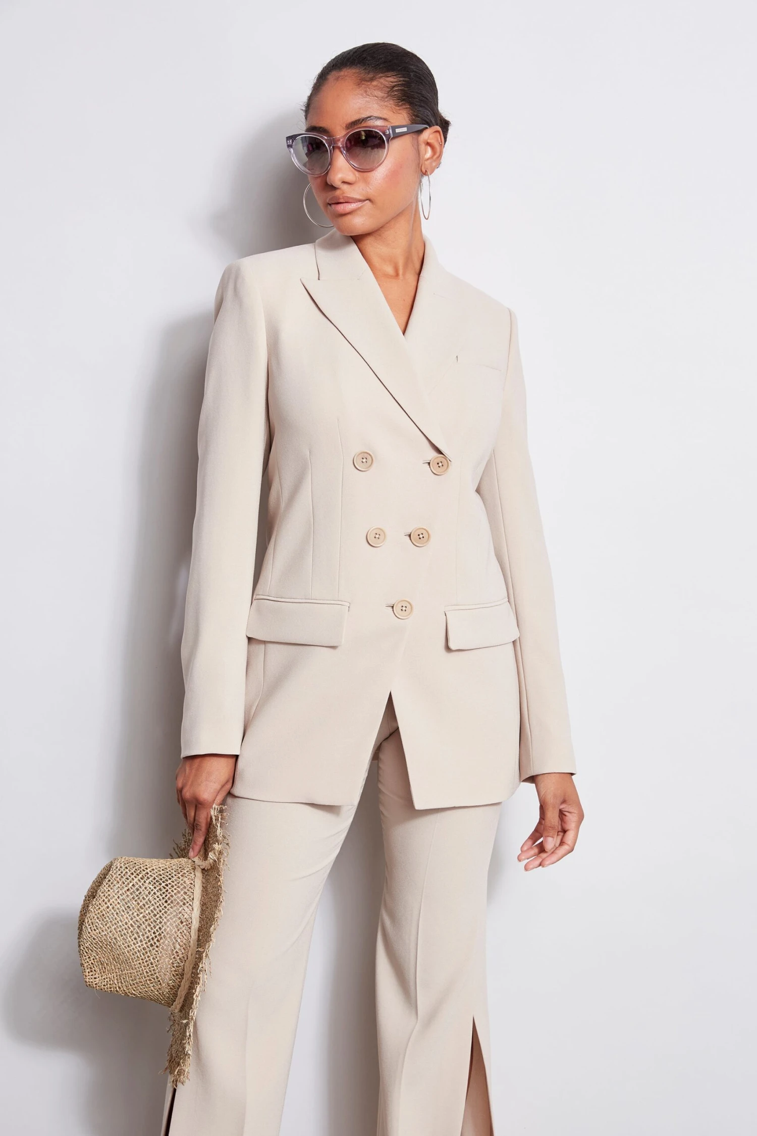 We love the modern proportion & vibe of our five button double breasted blazer. Pair it with its matching pants for a chic monotone column or push up the sleeves & mix it up with denim for an easy casual vibe.