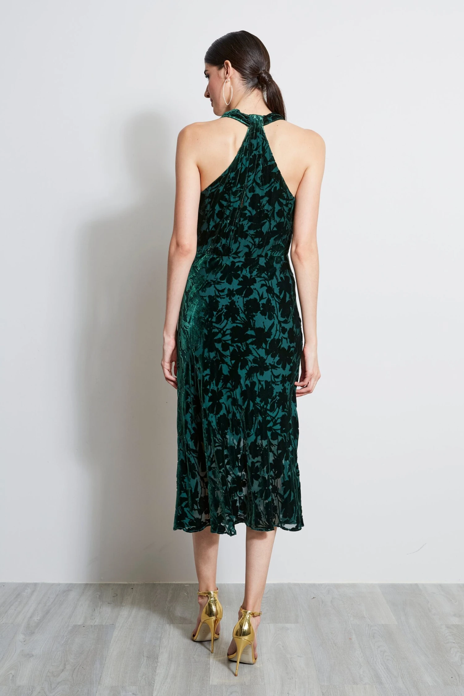 Elie chose a Luxe floral Burn Out Velvet for his draped cowl neckline Halter Dress. The fluid midi length lends it a modern romantic vibe.