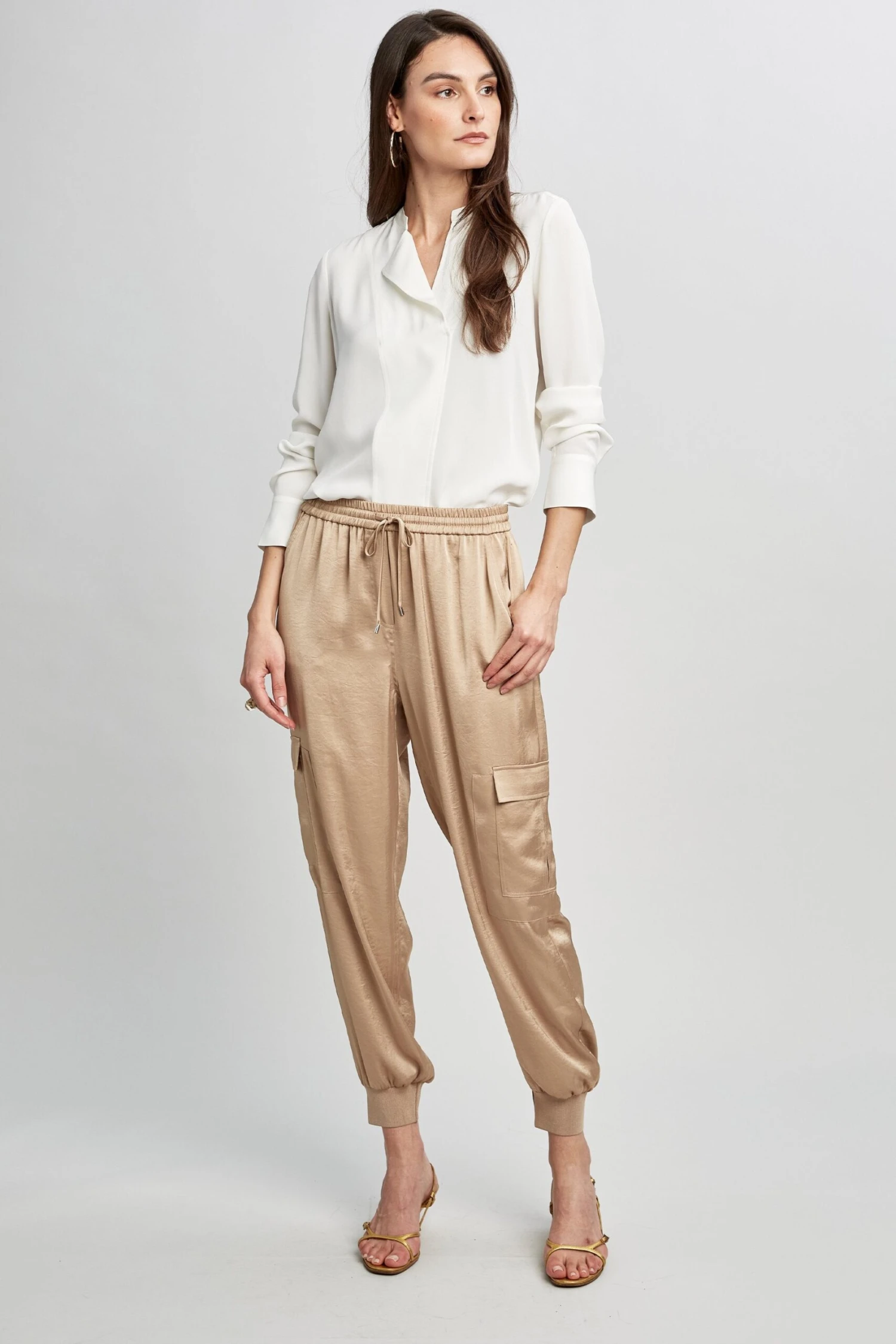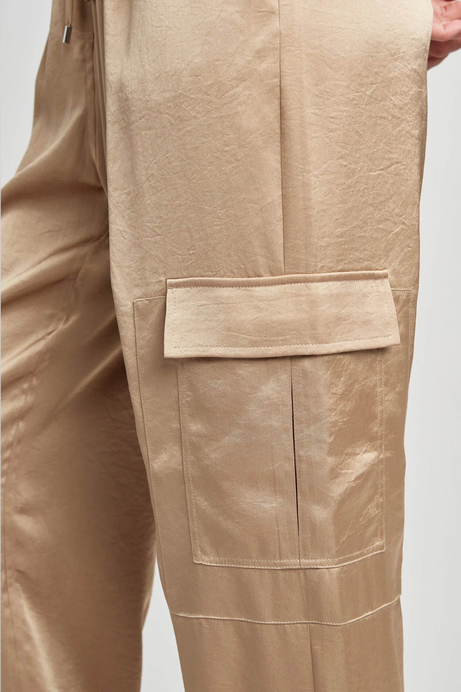 Modern Washed Satin lends a casual chic expression to our Cargo Pant. The relaxed fit, drawstring waist & rib knit cuffs are the definition of effortless sophistication.