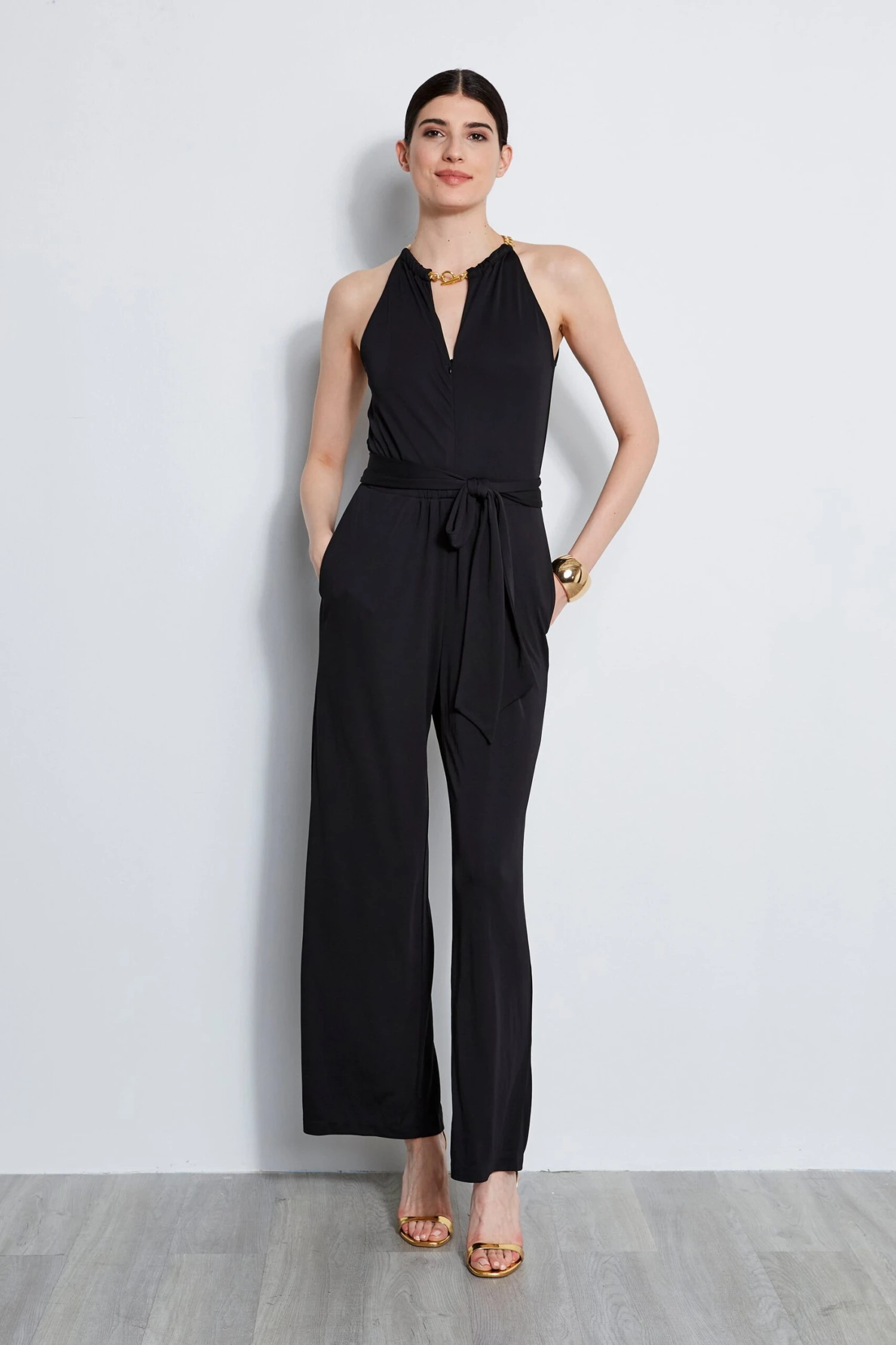 - Matte Jersey Wide-Leg, Sleeveless Jumpsuit with Sash & Gold Chain Neckline