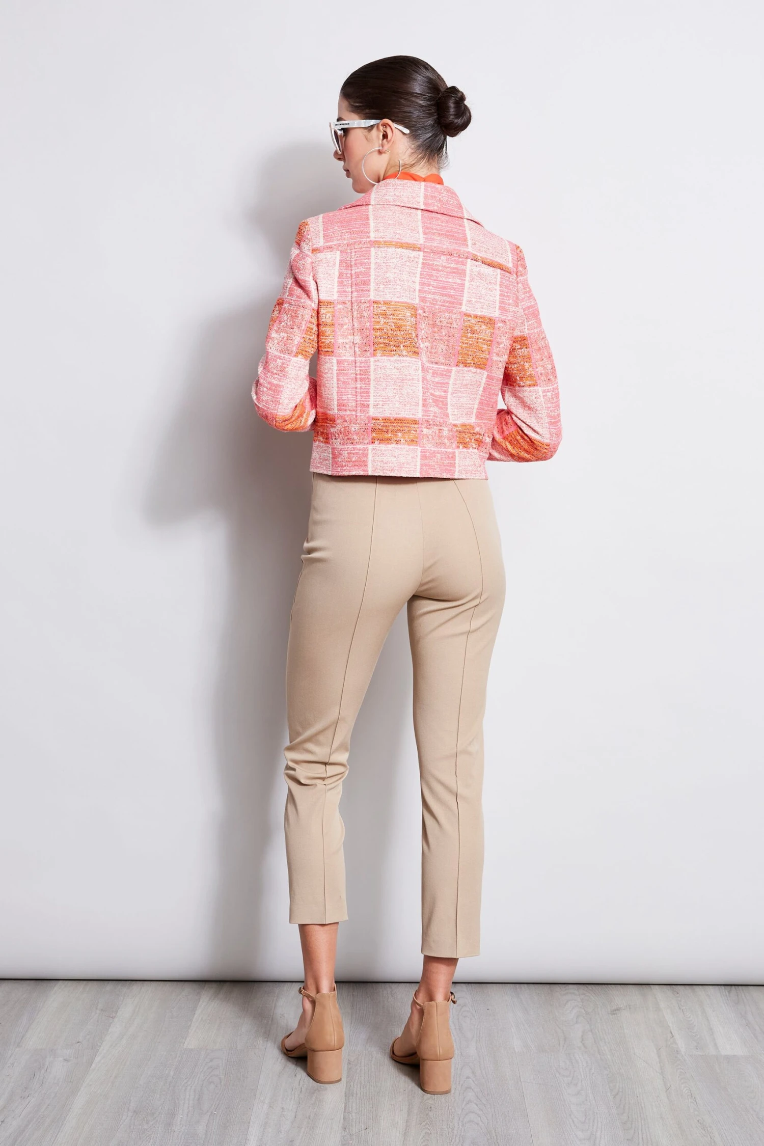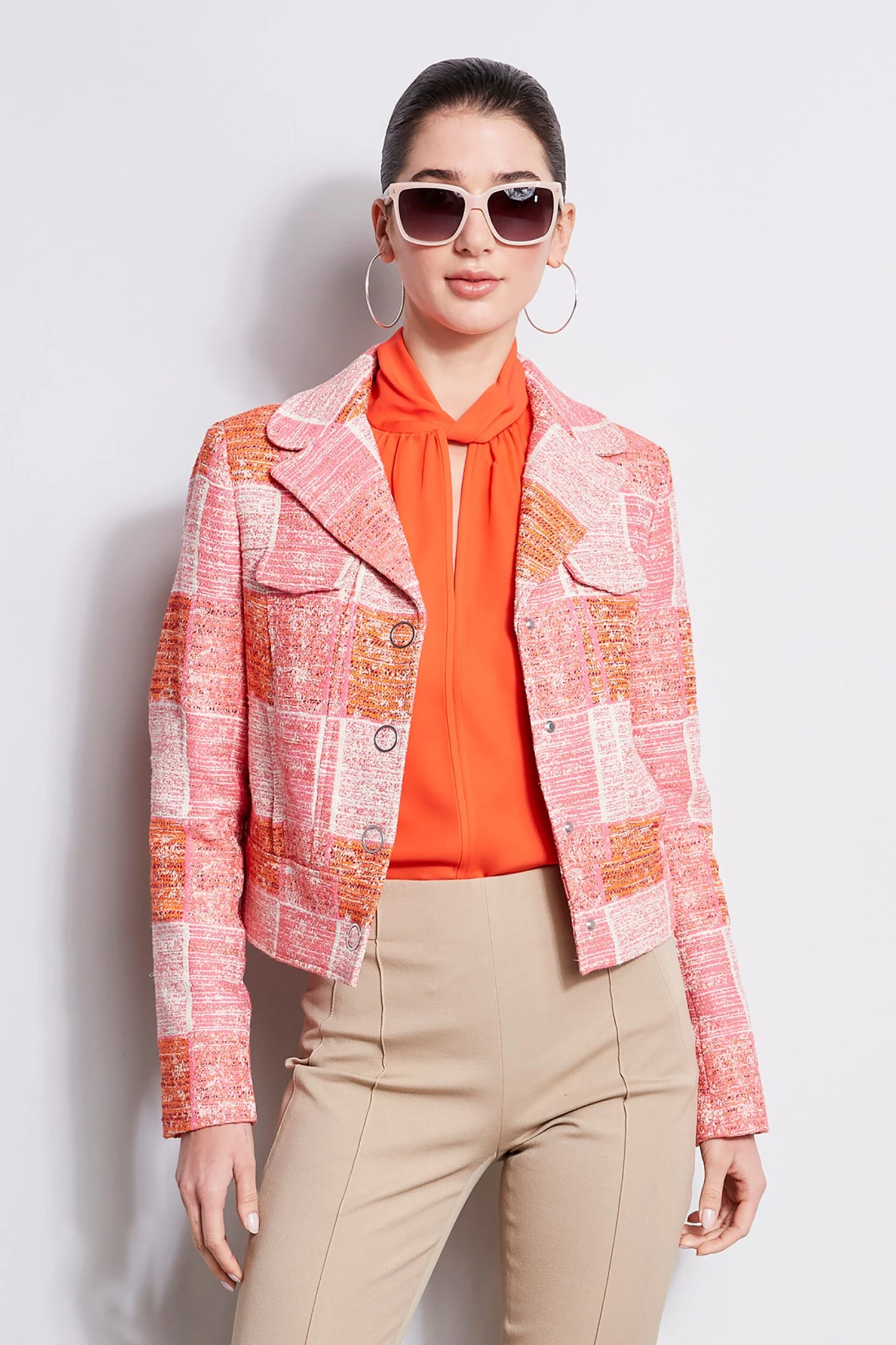 Elie chose a graphic Italian fabric for his sporty chic cropped jacket. the playful weave and colors are great mixed with jeans or our Wide Leg Fluid Crepe Pant – this jacket elevates every look.