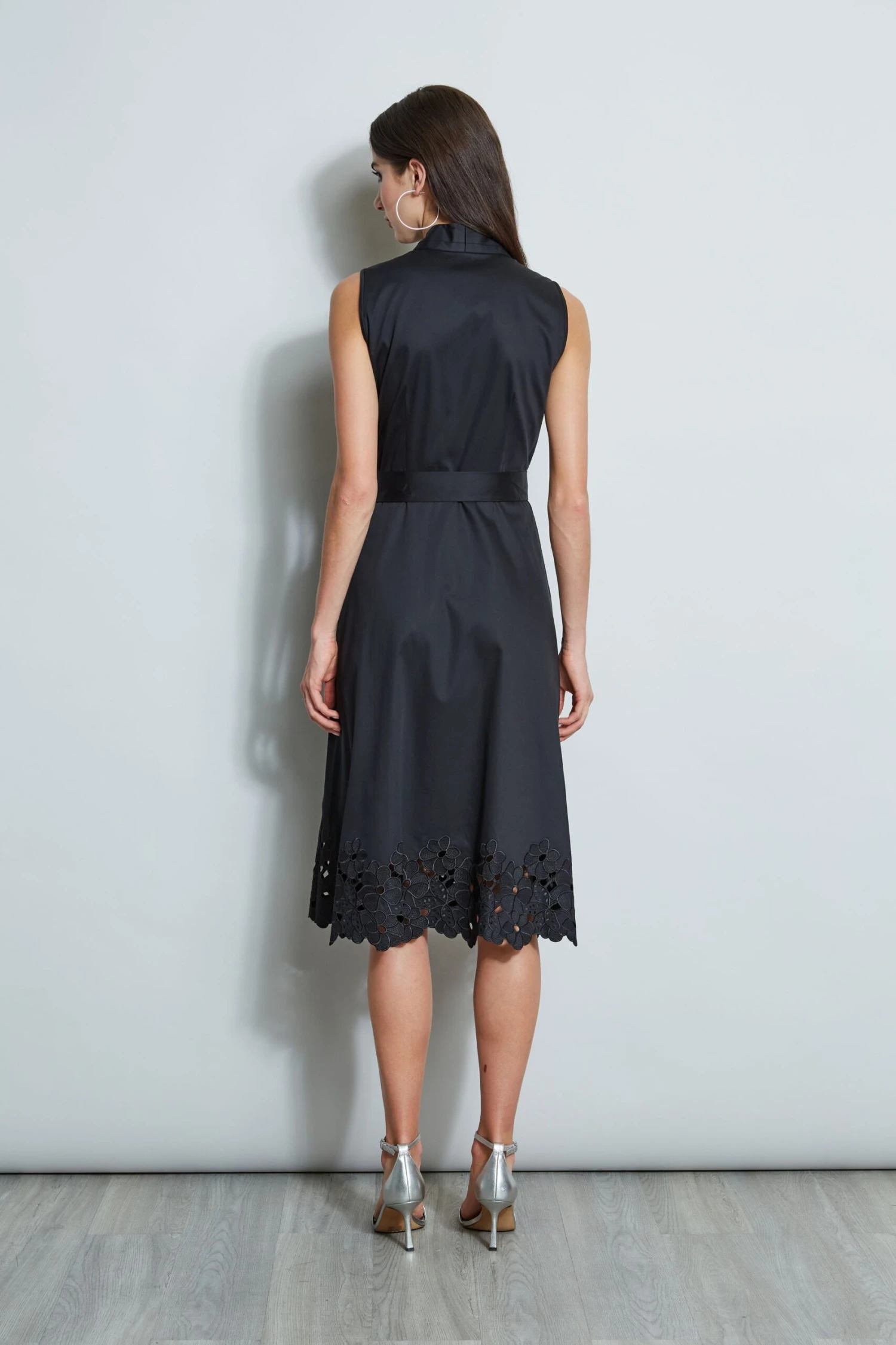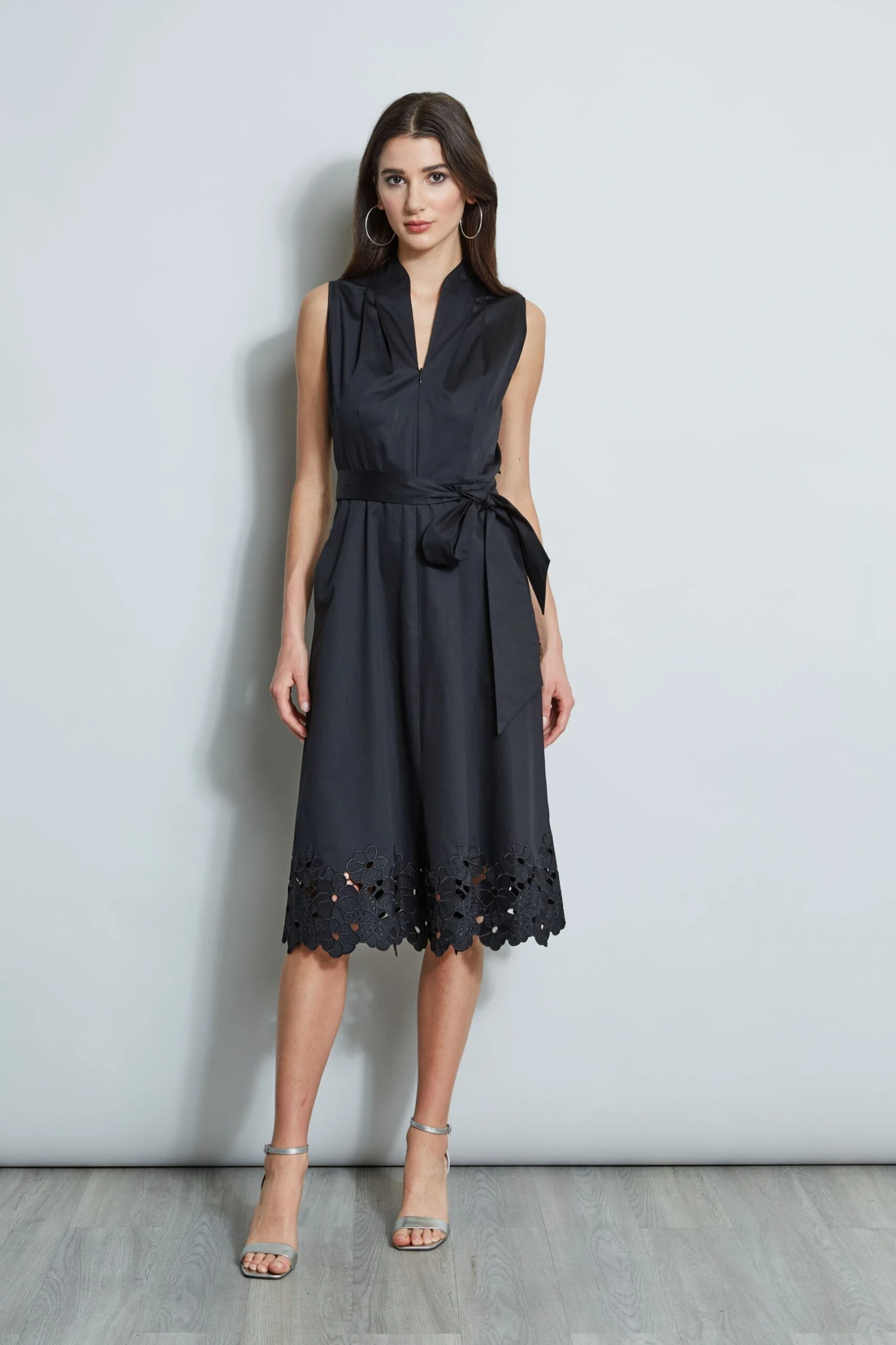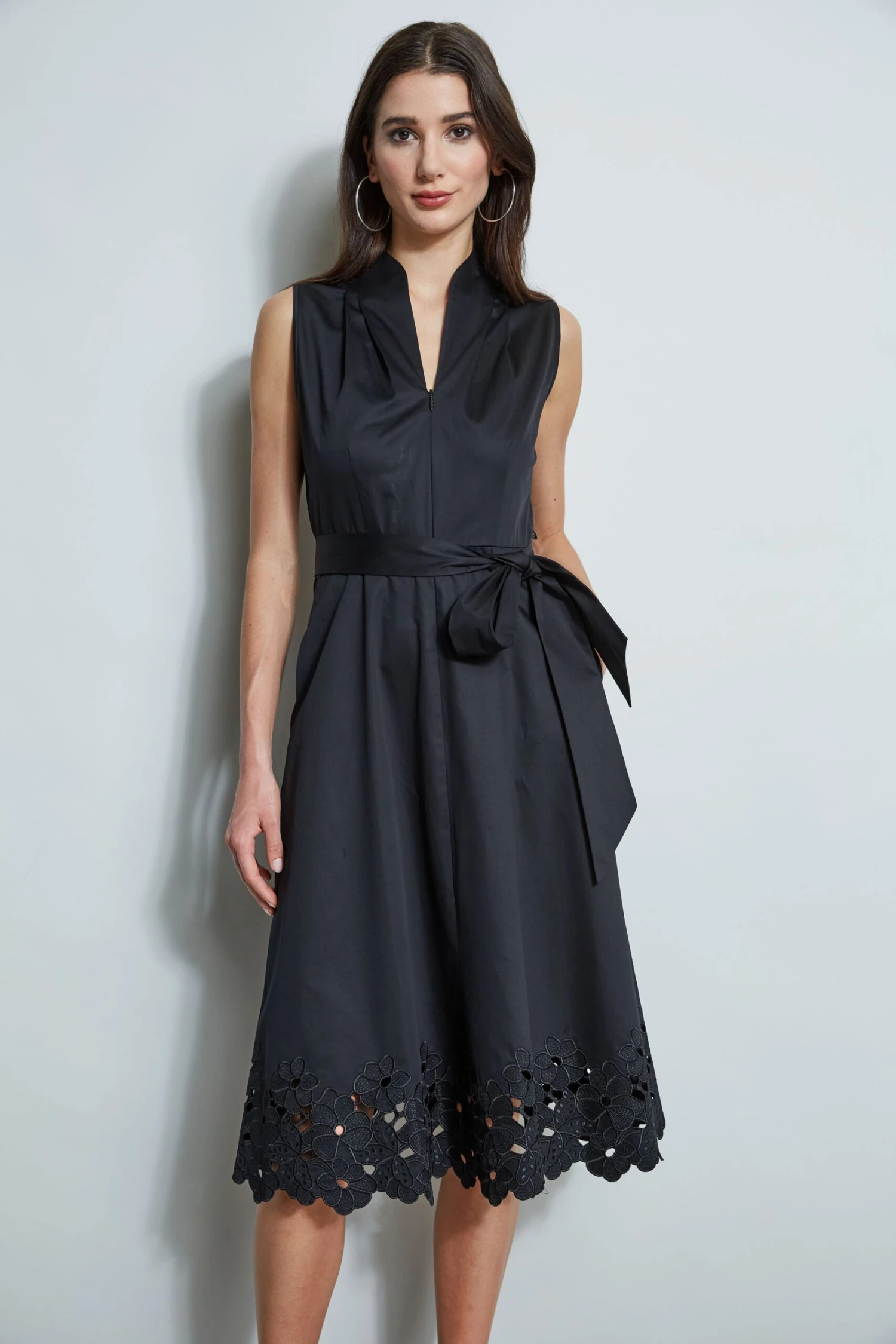 - Sleeveless Cotton Poplin Tie Front Midi A-Line Dress with an embroidered hem