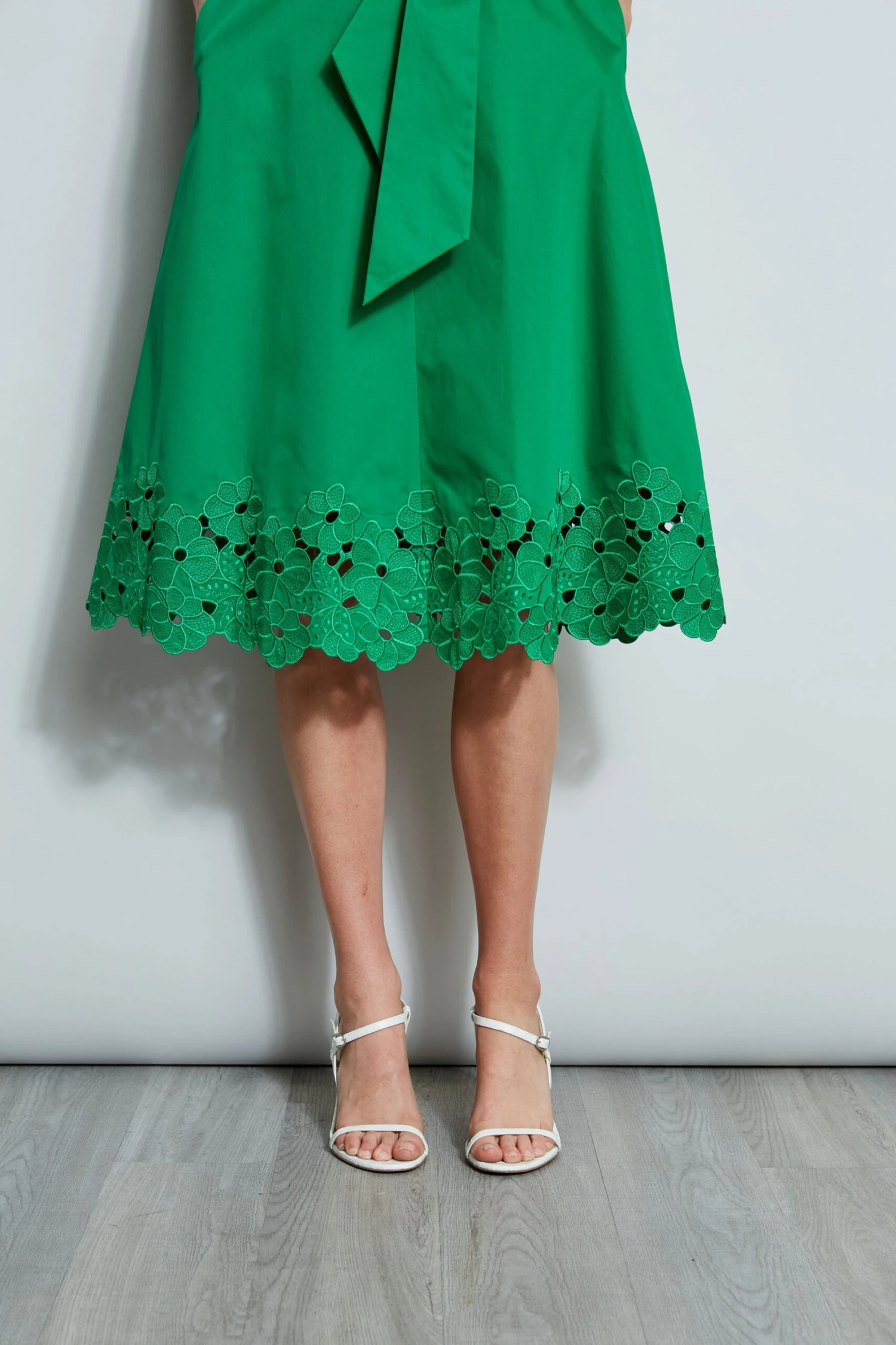 Our favorite stretch Cotton Poplin has the Luxe Patina and comfort we love. The unique embroidered hem on the soft full skirt and the contour pleat neckline detail give our zip front dress the designer edge.