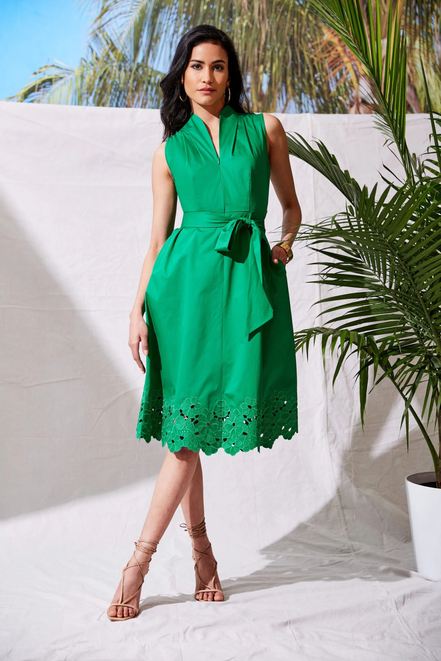 - Sleeveless Cotton Poplin Tie Front Midi A-Line Dress with an embroidered hem