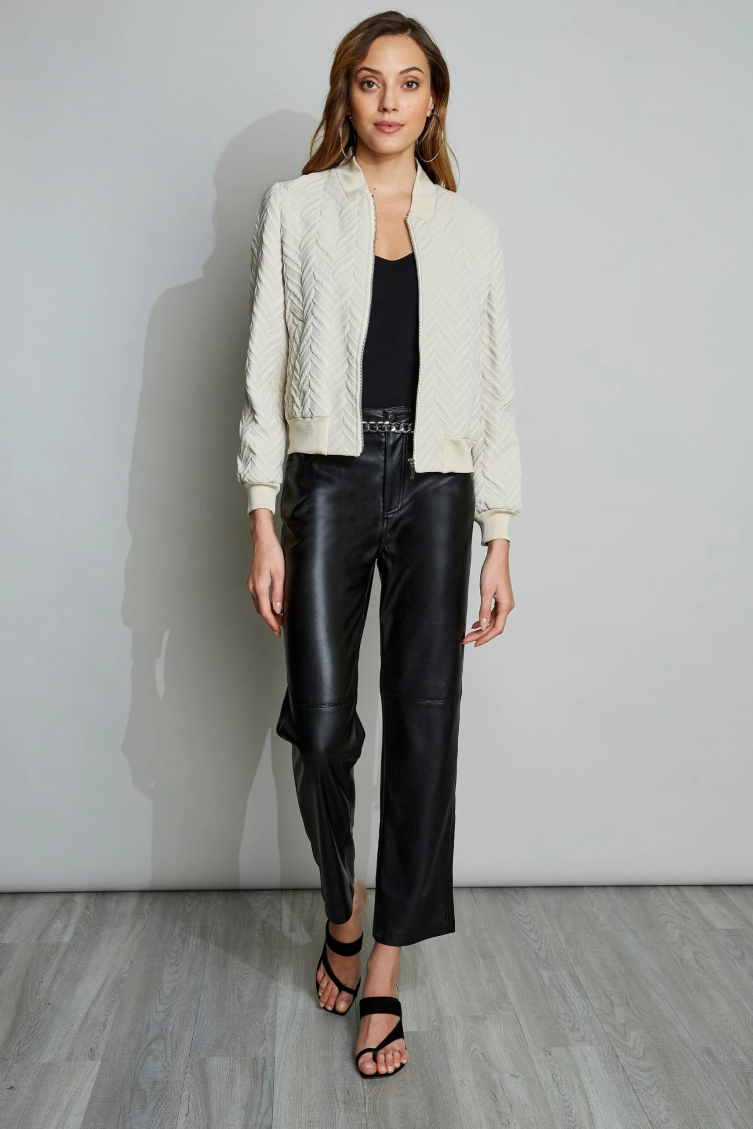 Fall in love with the chic texture of our Jacquard Bomber. Its graphic Jacquard Herringbone fabric was woven for us in Italy. The knitted trim & graphic zipper lend a sporty vibe. Wear it dressed up over a dress or down over our favorite jean.Â