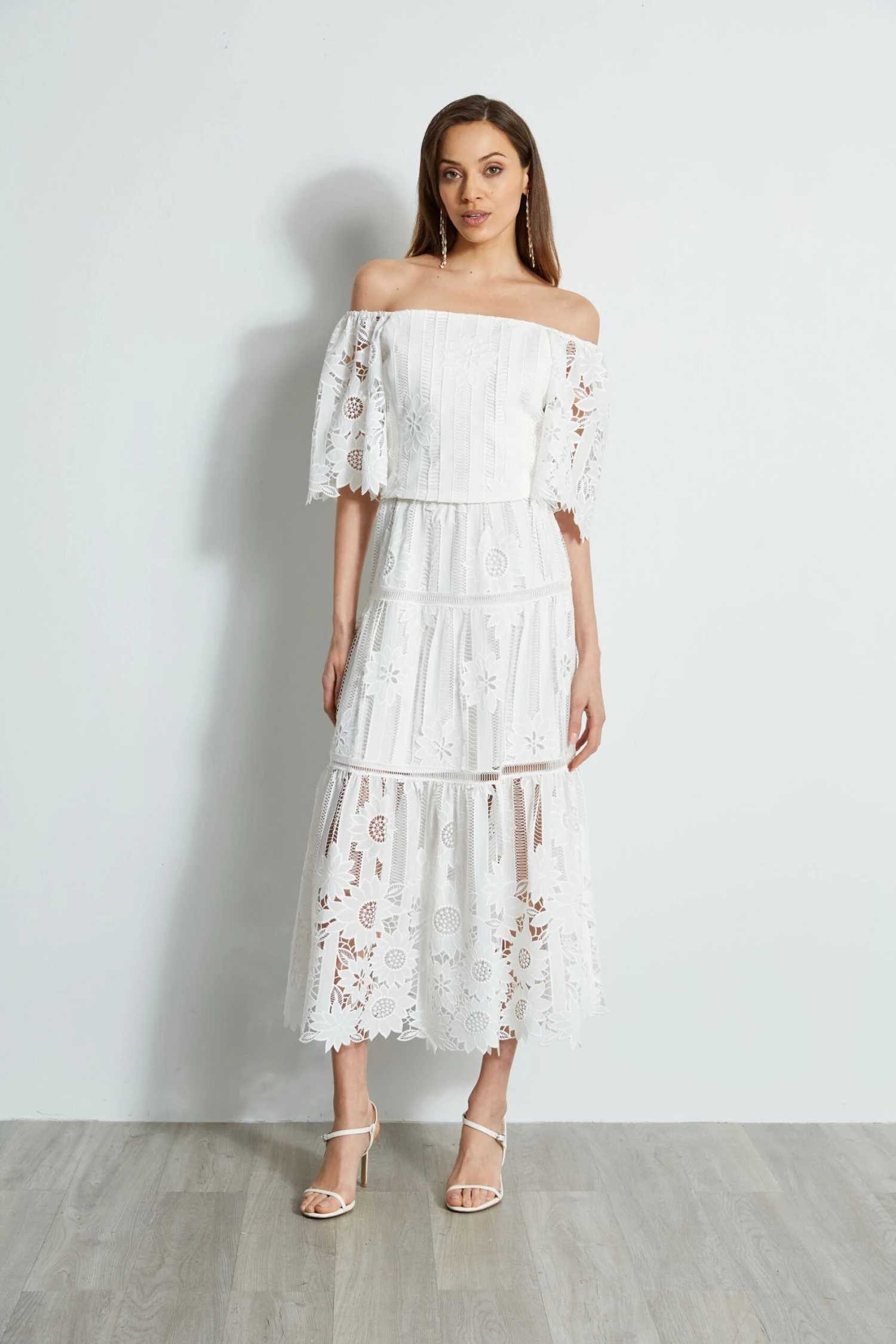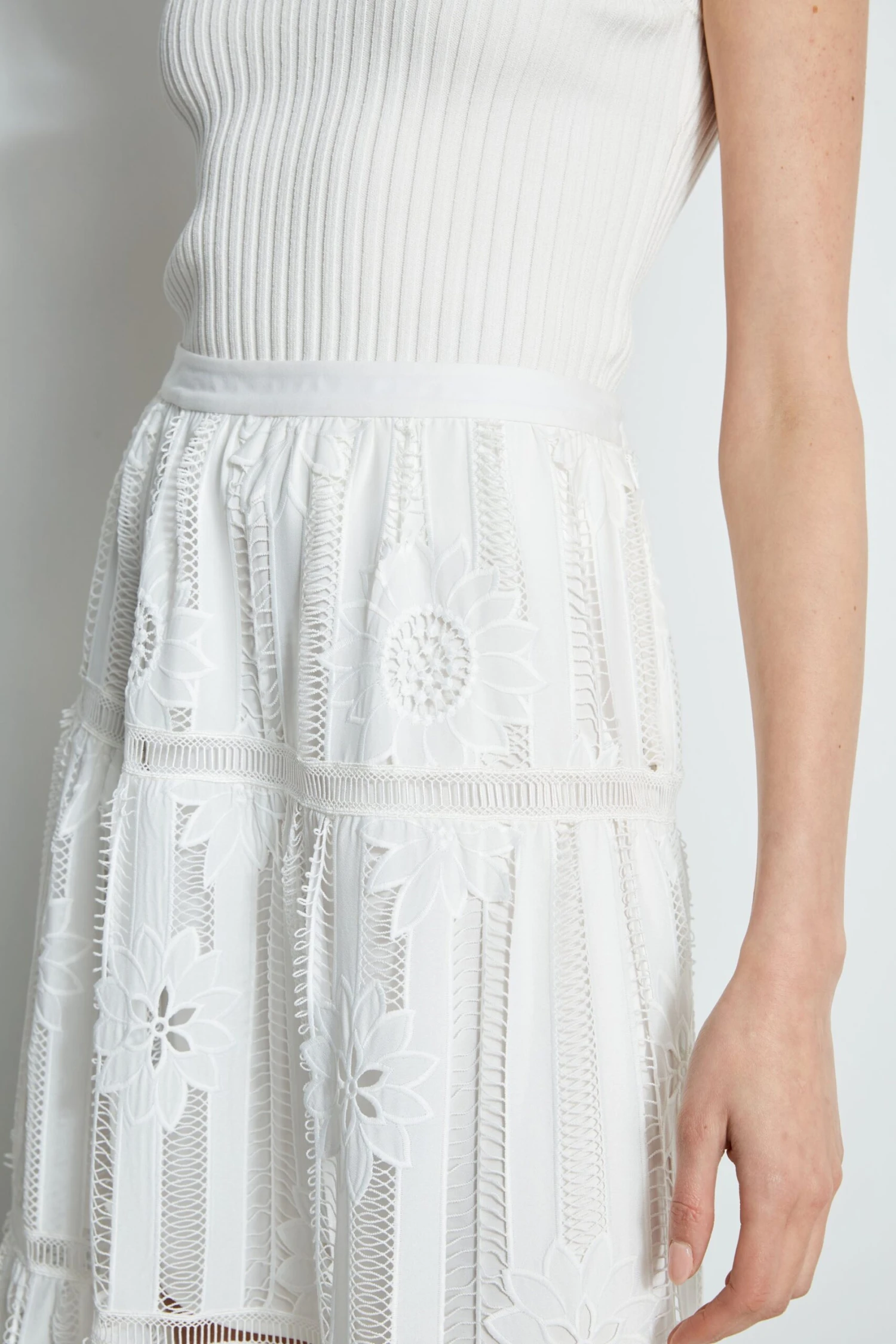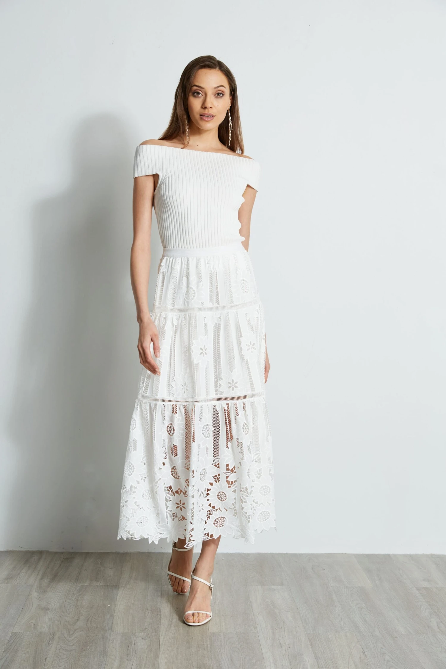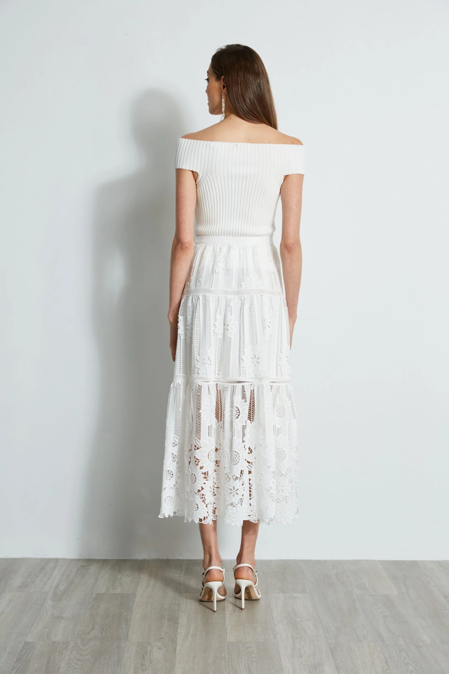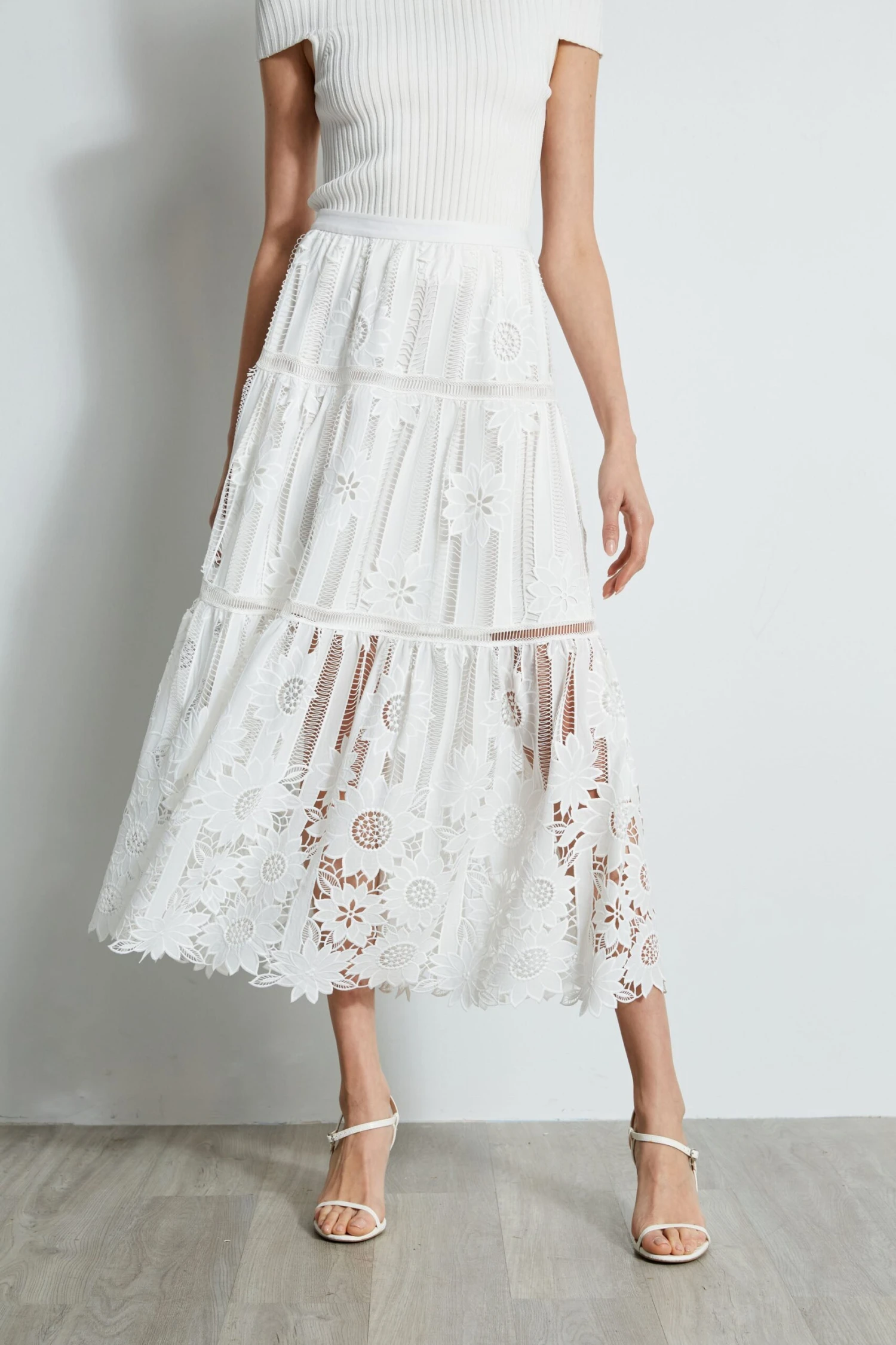 Our Floral Cut Out Embroidery Lace Skirt is a romantic addition to your warm weather wardrobe. Softly gathered tiered pieces are connected with a delicate lattice lace. The Skirt’s hem has beautiful, scalloped embroidery. It’s great for pairing with its matching Off Shoulder Top or with our rib Knits. The semi transparent skirt & fluidity make this skirt perfect for dressing up or down.