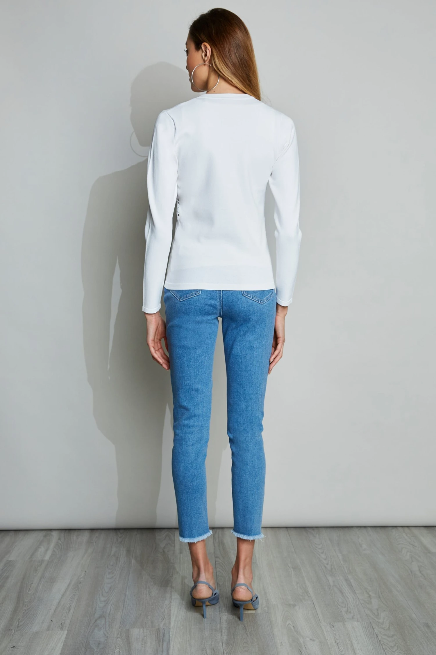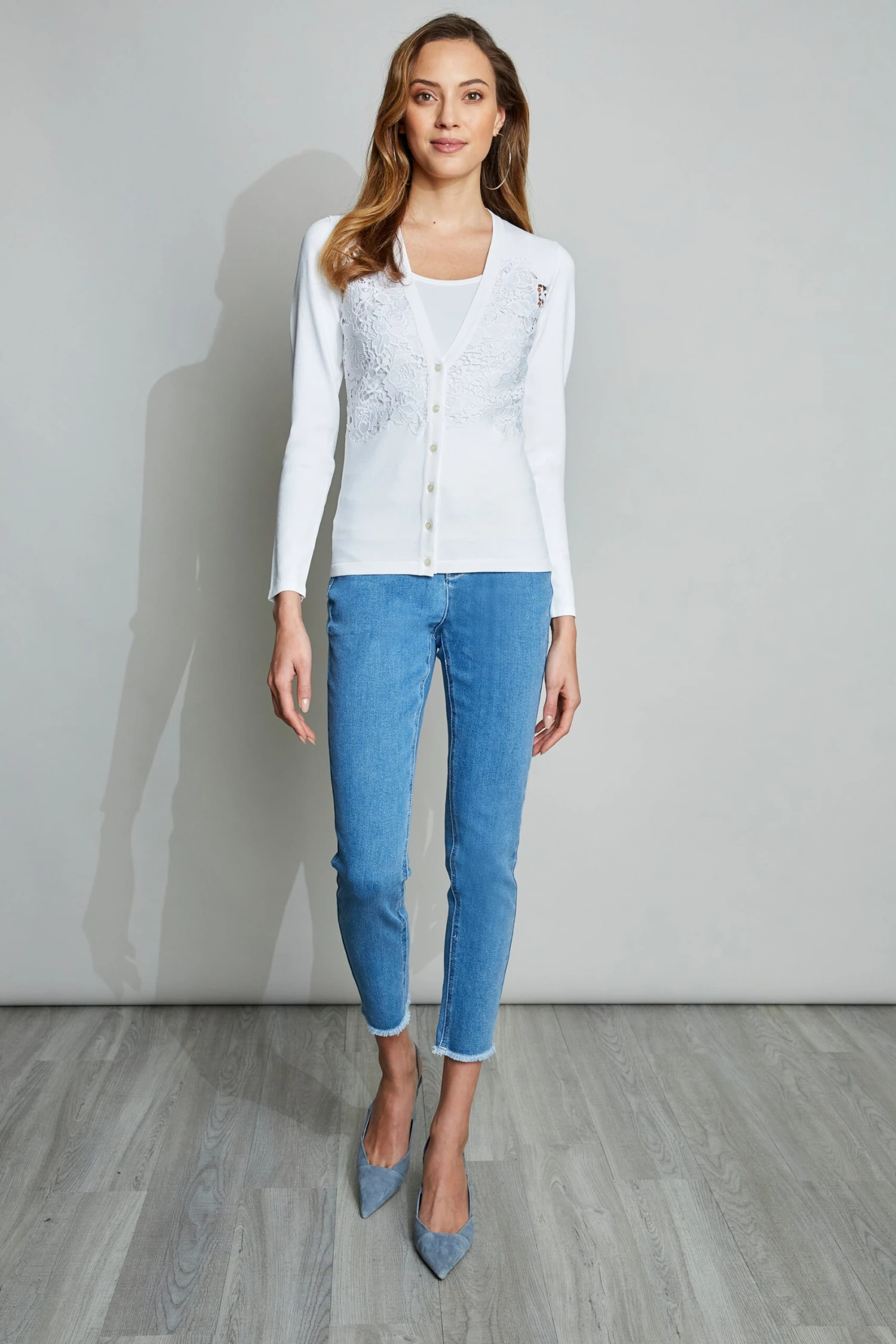You will fall in love with this lace detailed body skimming cardigan. Designed in a Luxe Viscose blend, our V-neck cardigan has a romantic Lace applique insert and looks as good dressed down with denim or up.