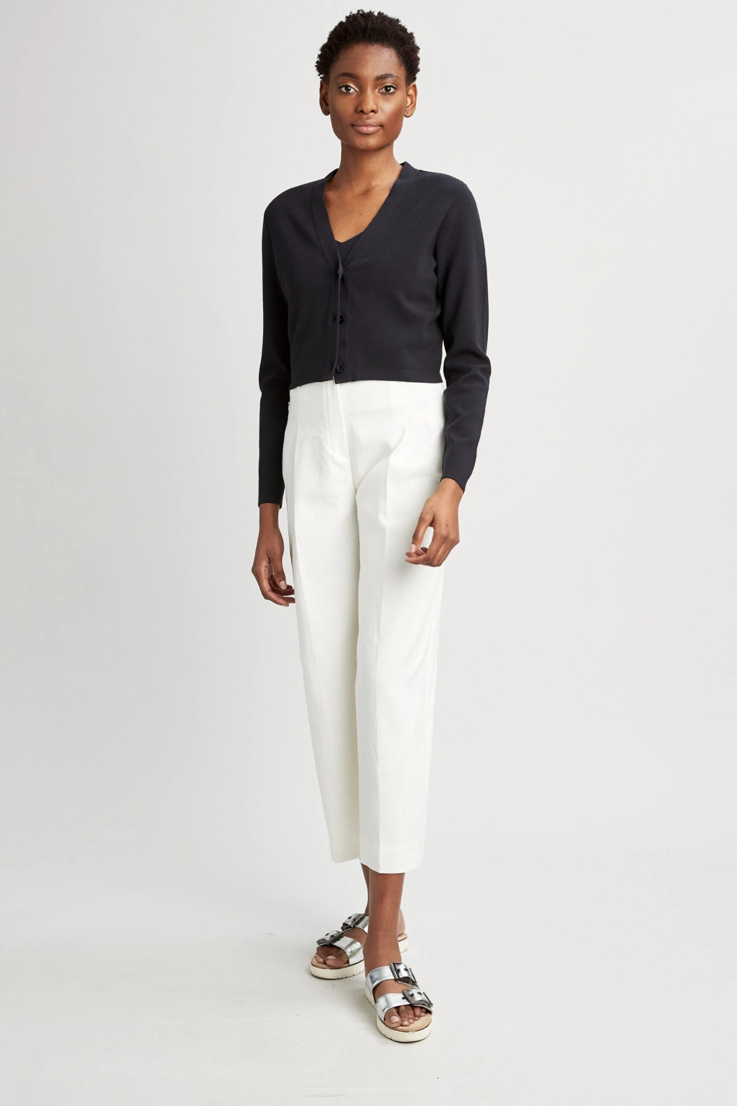 Designed to be your favorite cardigan, the Molly sweater has a deep V neck, three button closure and cropped body. It is modern, buttoned up on its own and paired with the Venus sweater. It’s a look that’s great for work or a cool evening out.