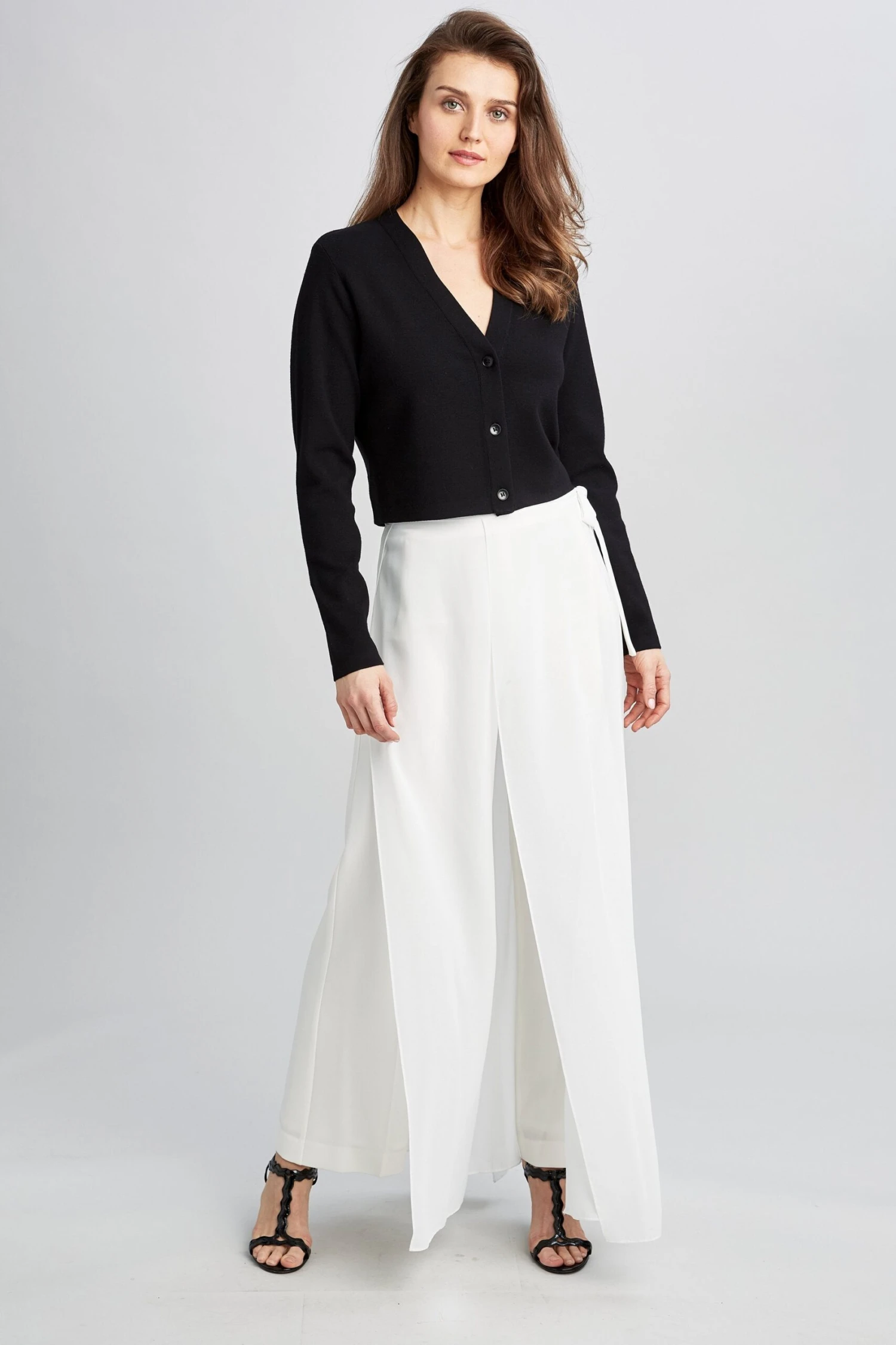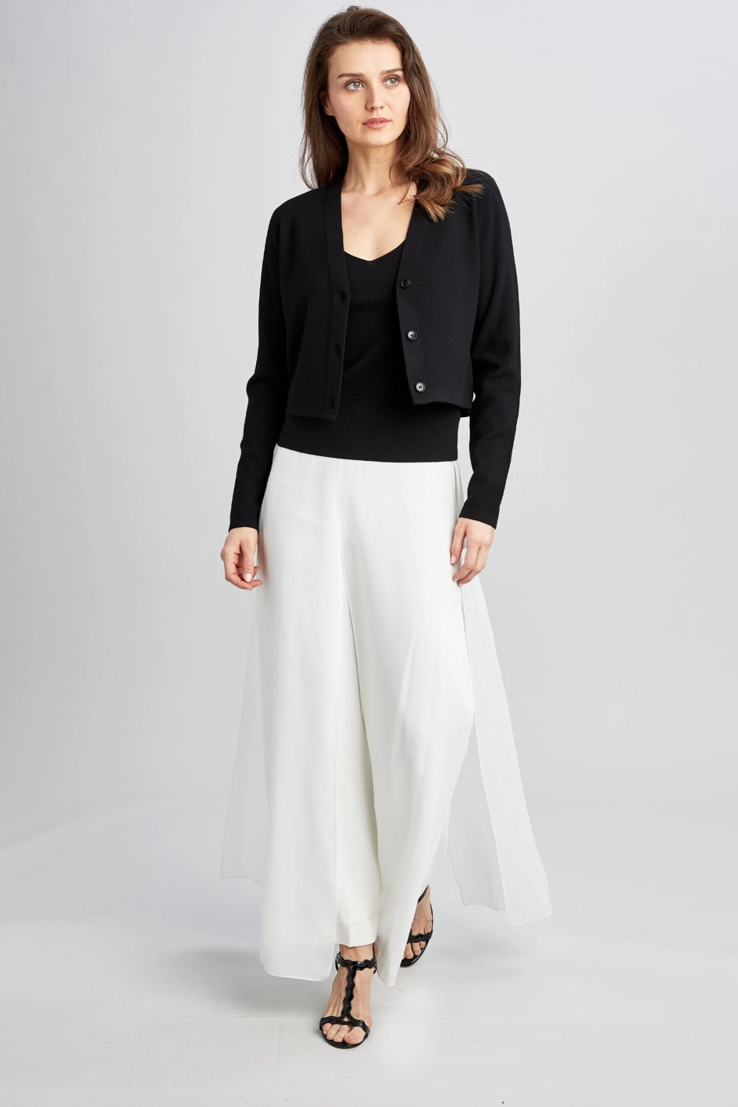 Designed to be your favorite cardigan, the Molly sweater has a deep V neck, three button closure and cropped body. It is modern, buttoned up on its own and paired with the Venus sweater. It’s a look that’s great for work or a cool evening out.