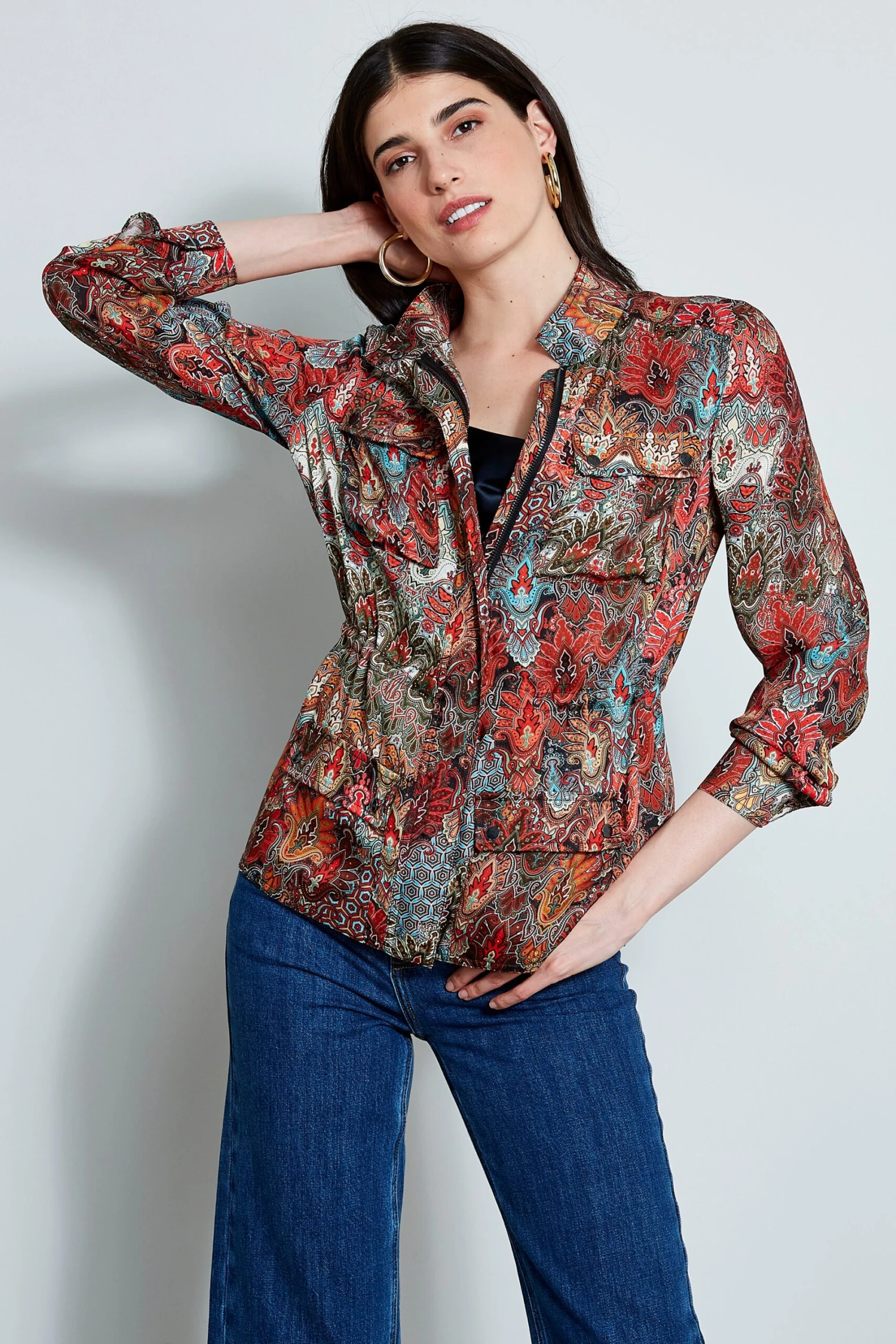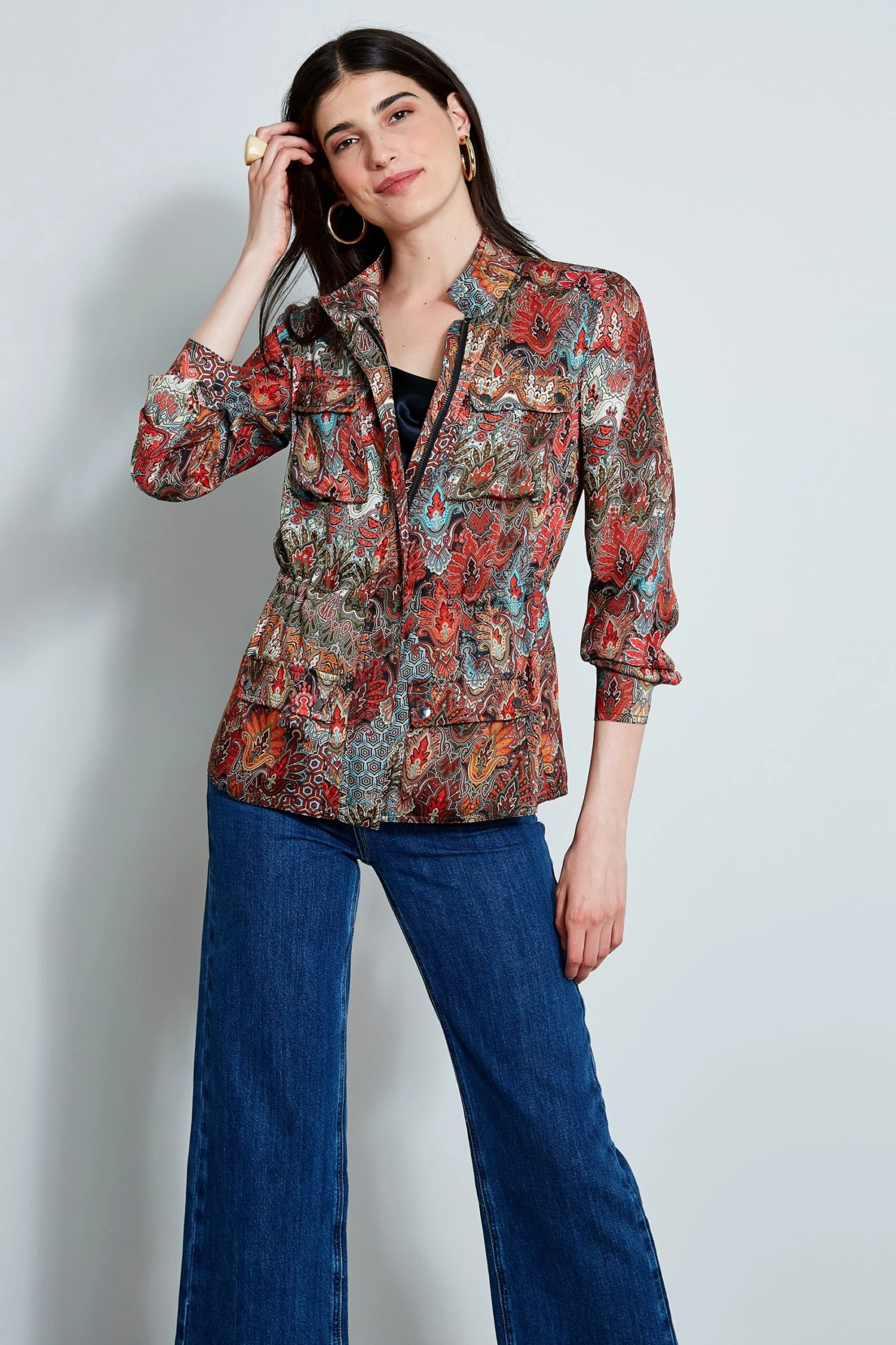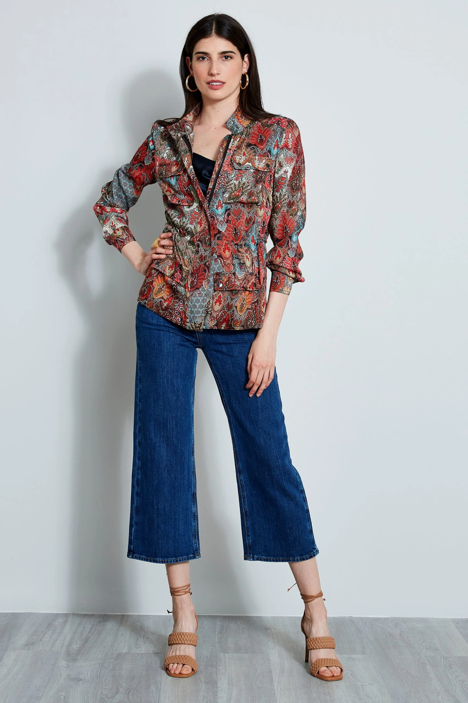 This is your closet’s next must-have jacket. The Boho Kashmir Paisley Print gives our Utility Cargo Jacket its cool factor. Safari Pockets, metal trim & a drawstring waist turn up the sporty factor. Dress it up or push up the sleeves and pair it with our flare denim jeans or satin drawstring pants. Perfect for Summer wear now and later transitioning into Fall.
