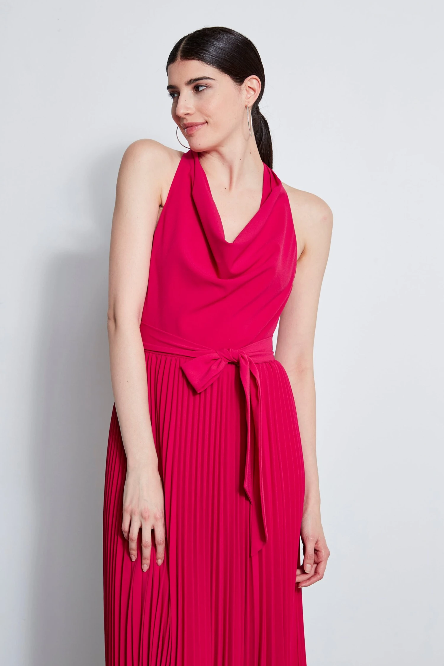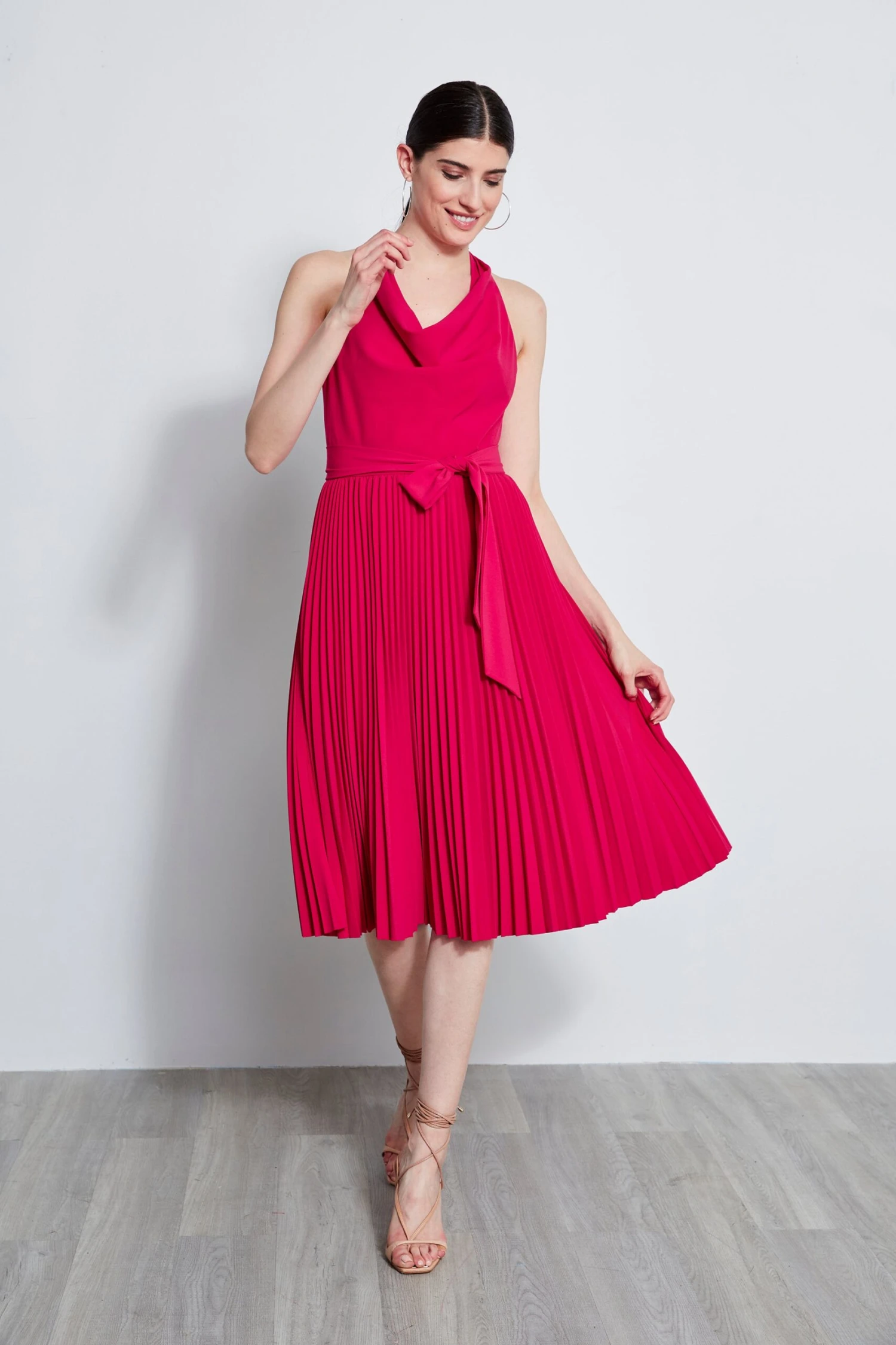 - Sleeveless Halter Midi Dress with Cowl Neckline, Self-Sash & Pleated Skirt