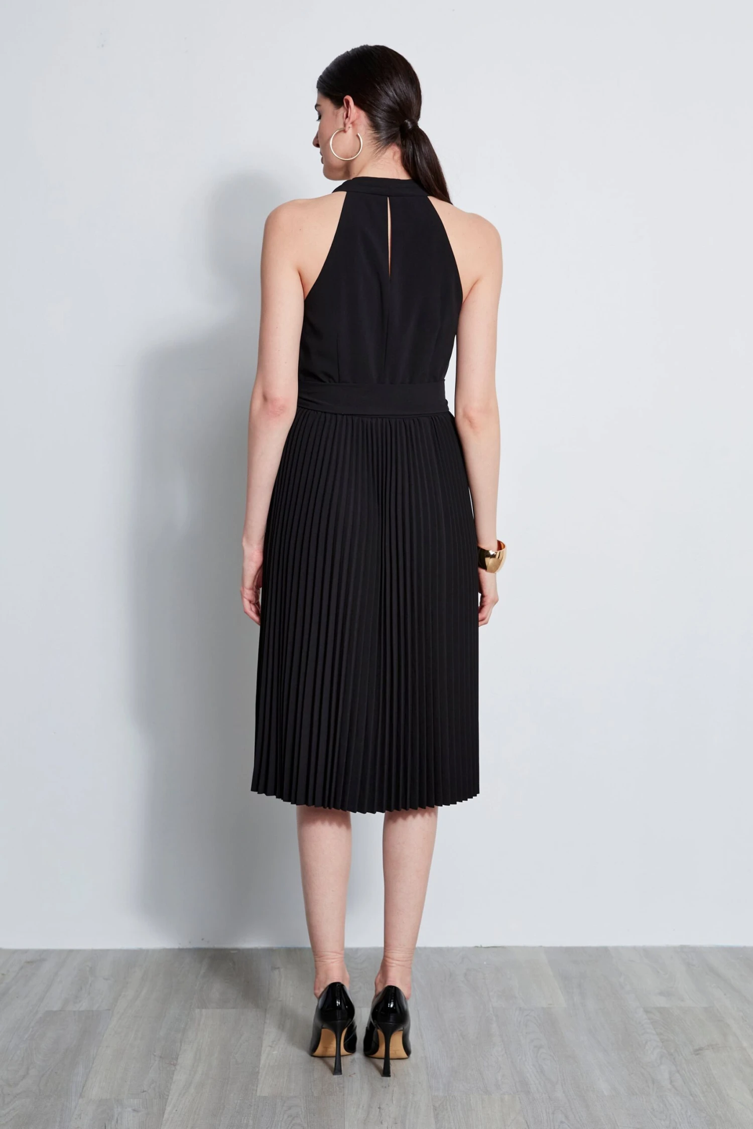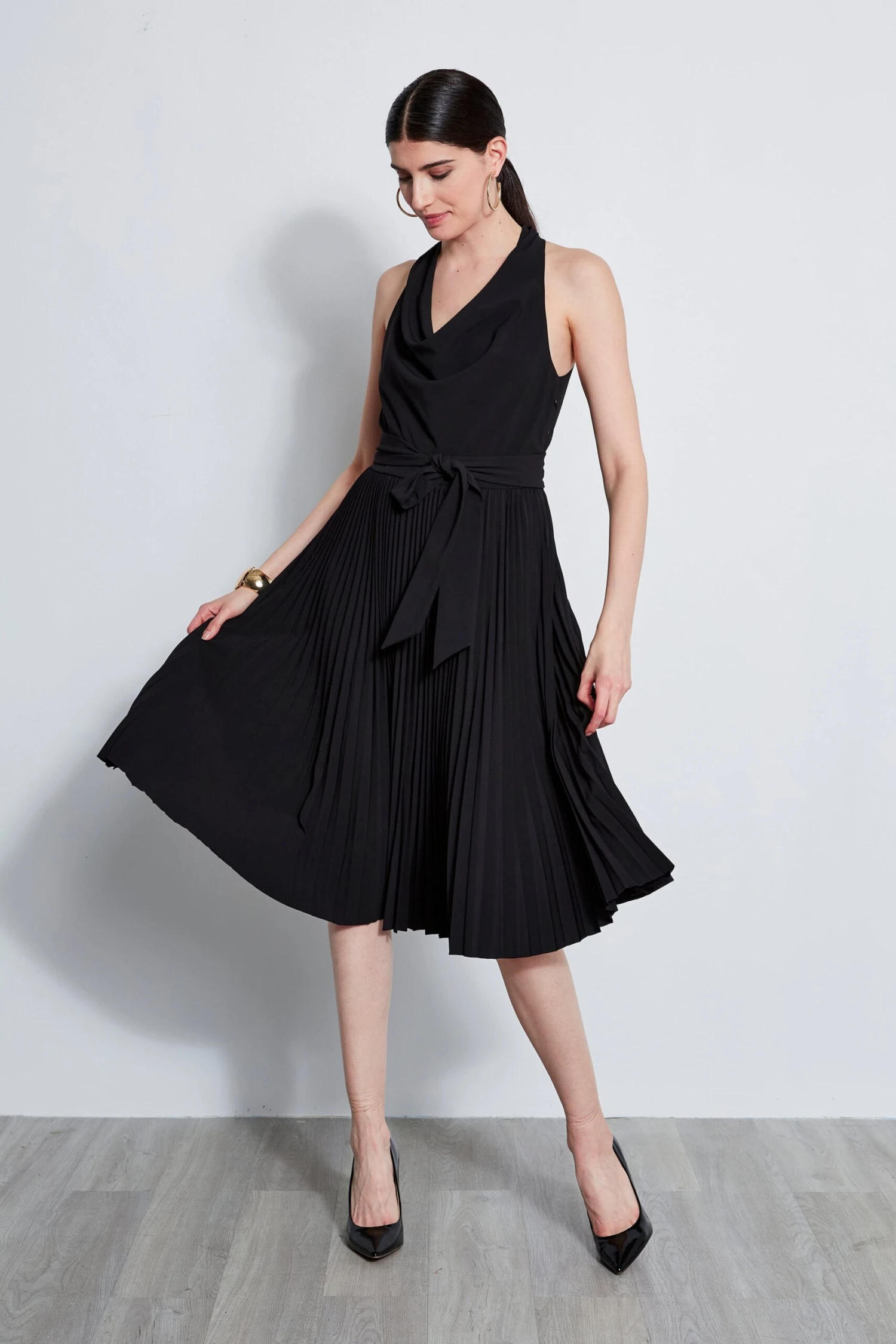 - Sleeveless Halter Midi Dress with Cowl Neckline, Self-Sash & Pleated Skirt