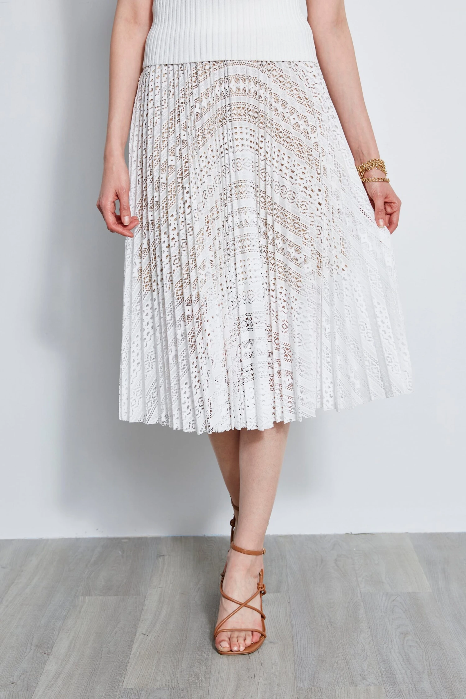 - Laser Cut Pleated Midi Skirt with Elastic Waist