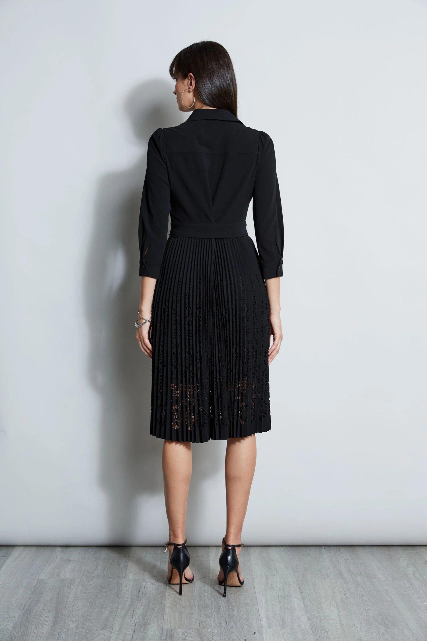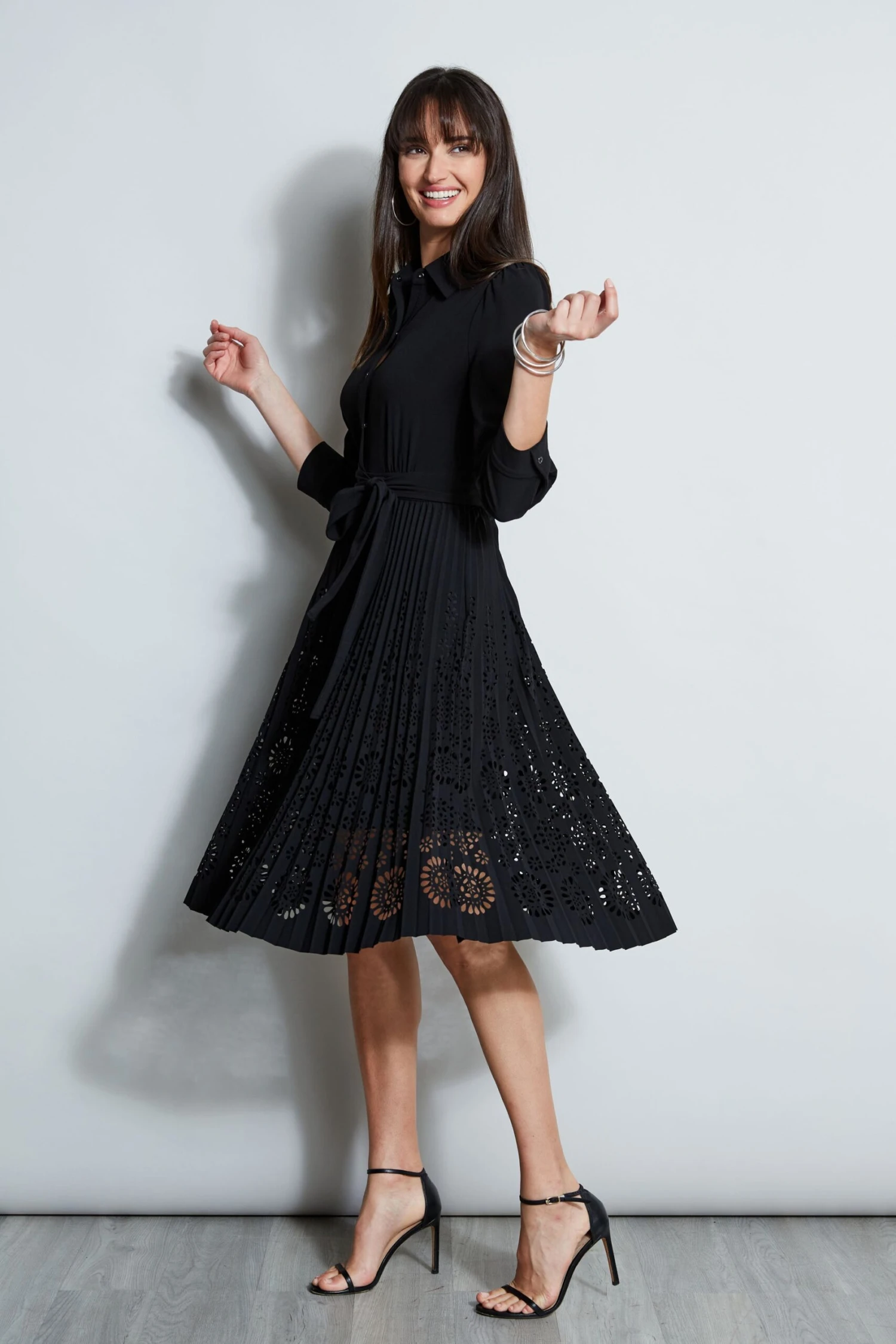 - Long Sleeve Fit & Flare Dress with a Knife Pleated Laser Cut Skirt