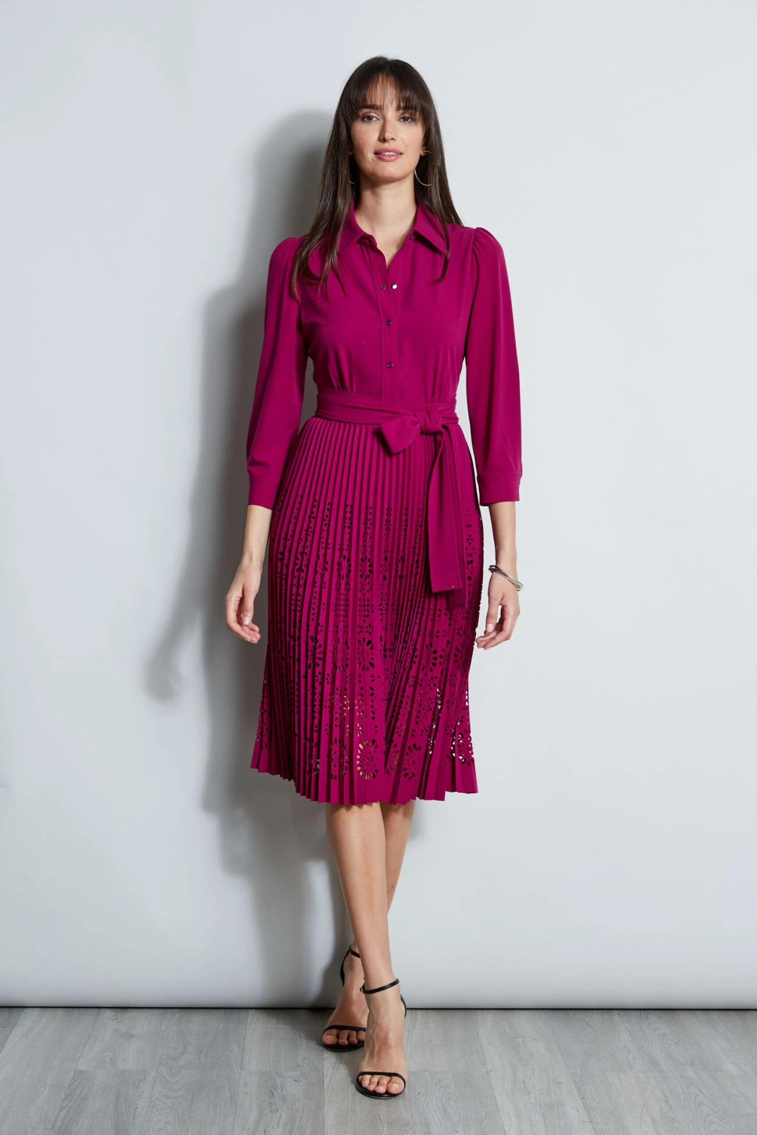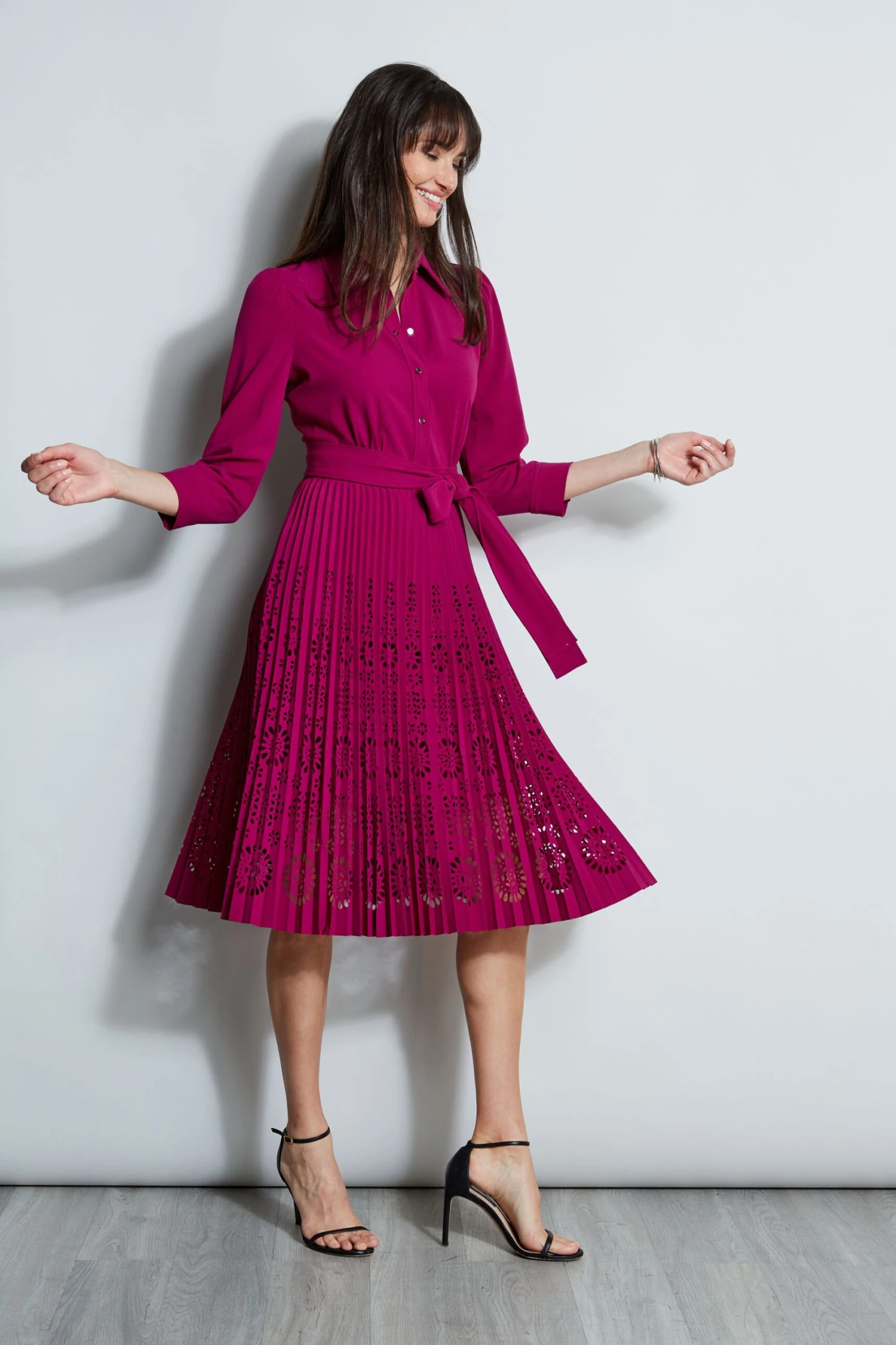 - Long Sleeve Fit & Flare Dress with a Knife Pleated Laser Cut Skirt