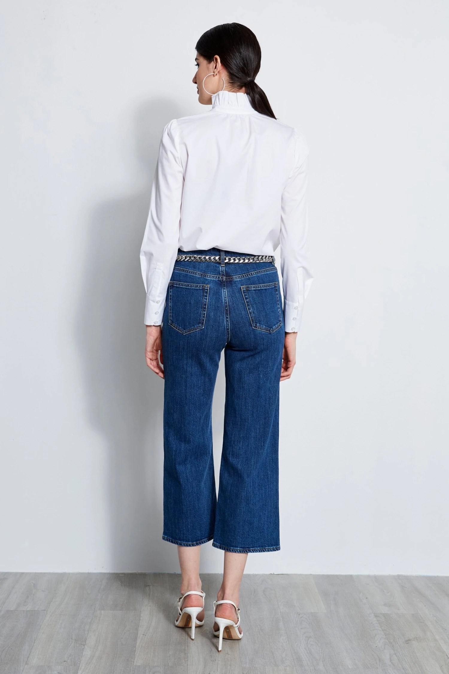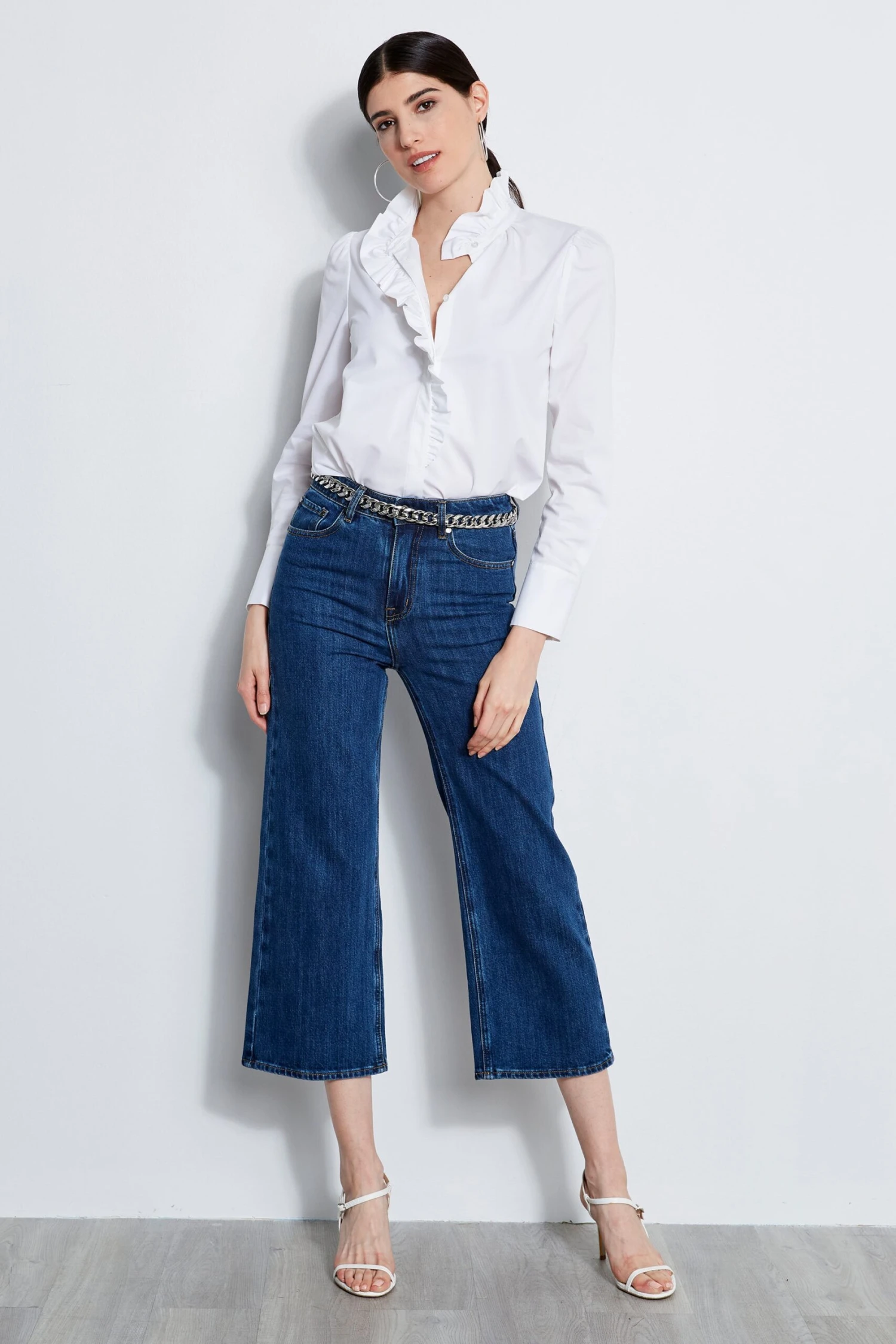 - Stretch Cotton Button Down Shirt with Ruffle Detailing & a Mock Neck