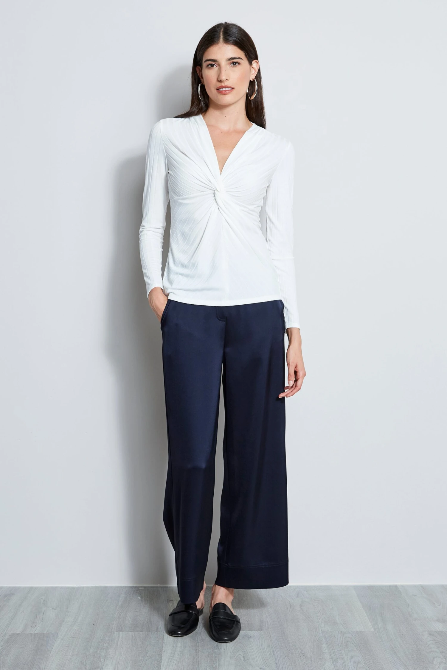 A fresh take on the long sleeve ribbed T-shirt. The twist front V-neck lends an artistic edge to this Luxe Ribbed Tee.