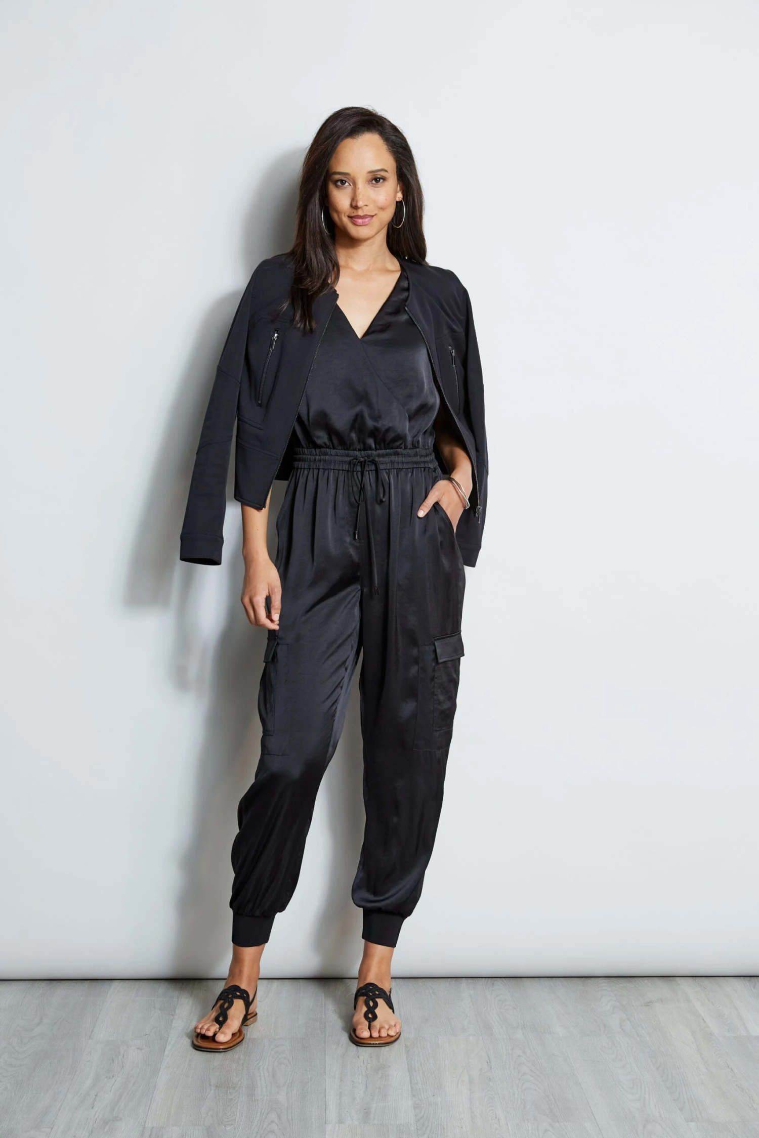 This sleek jumpsuit has an effortless, easy chic vibe. Done in Luxe Washed Satin, it features a mock wrap neckline, elastic drawstring waist, cargo pockets & rib knit cuffs. Style feels effortless in this one-piece!