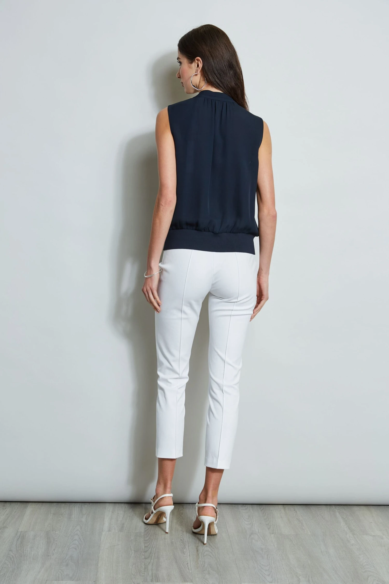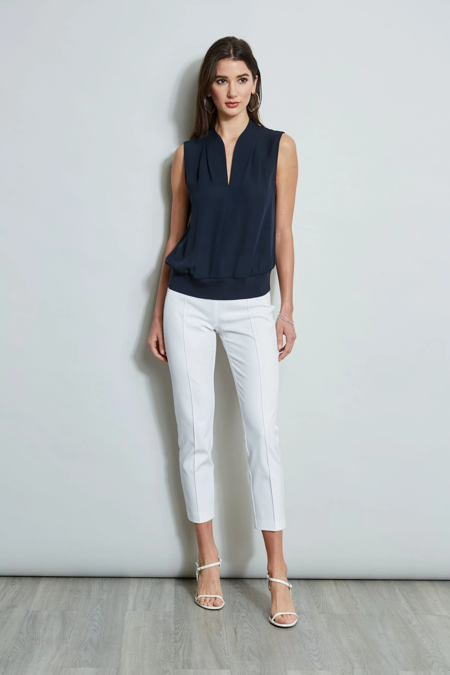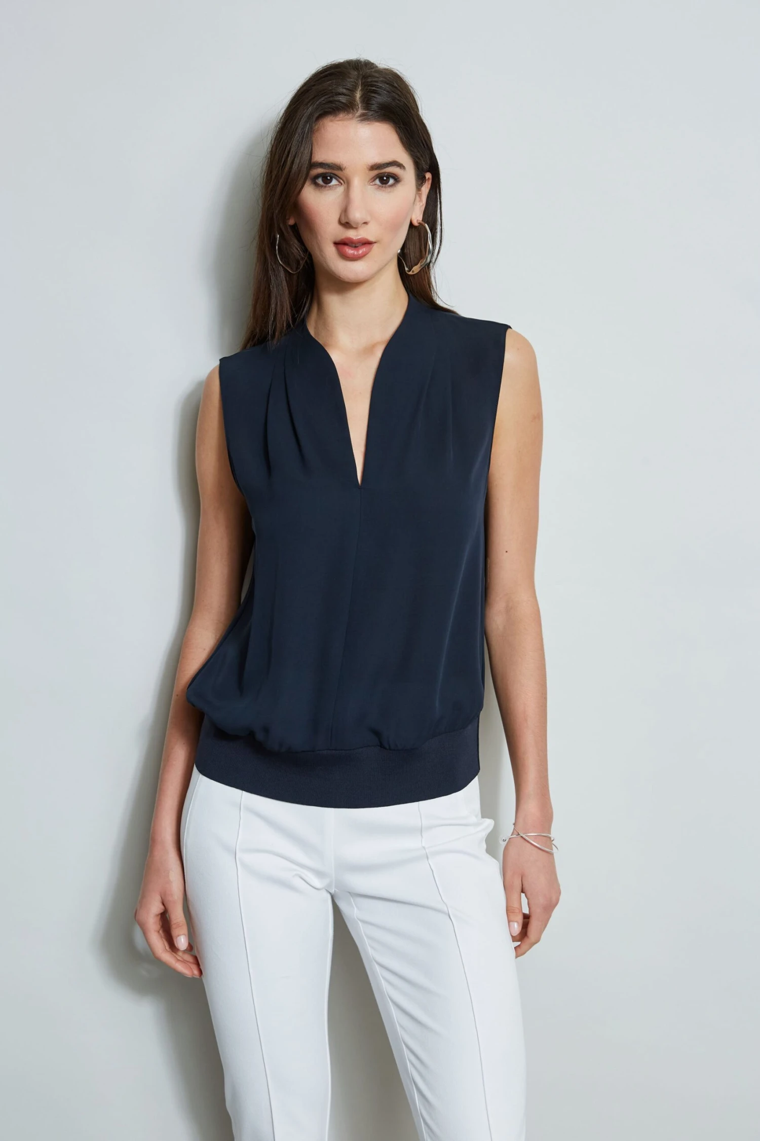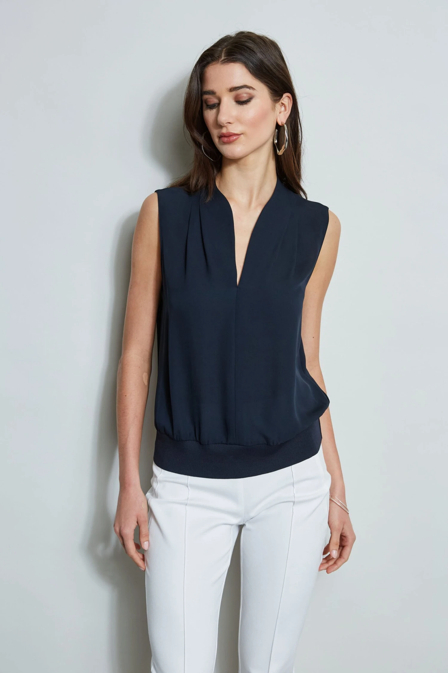 - Sleeveless, pleated shoulder top with stand collar, split neckline & rib hem