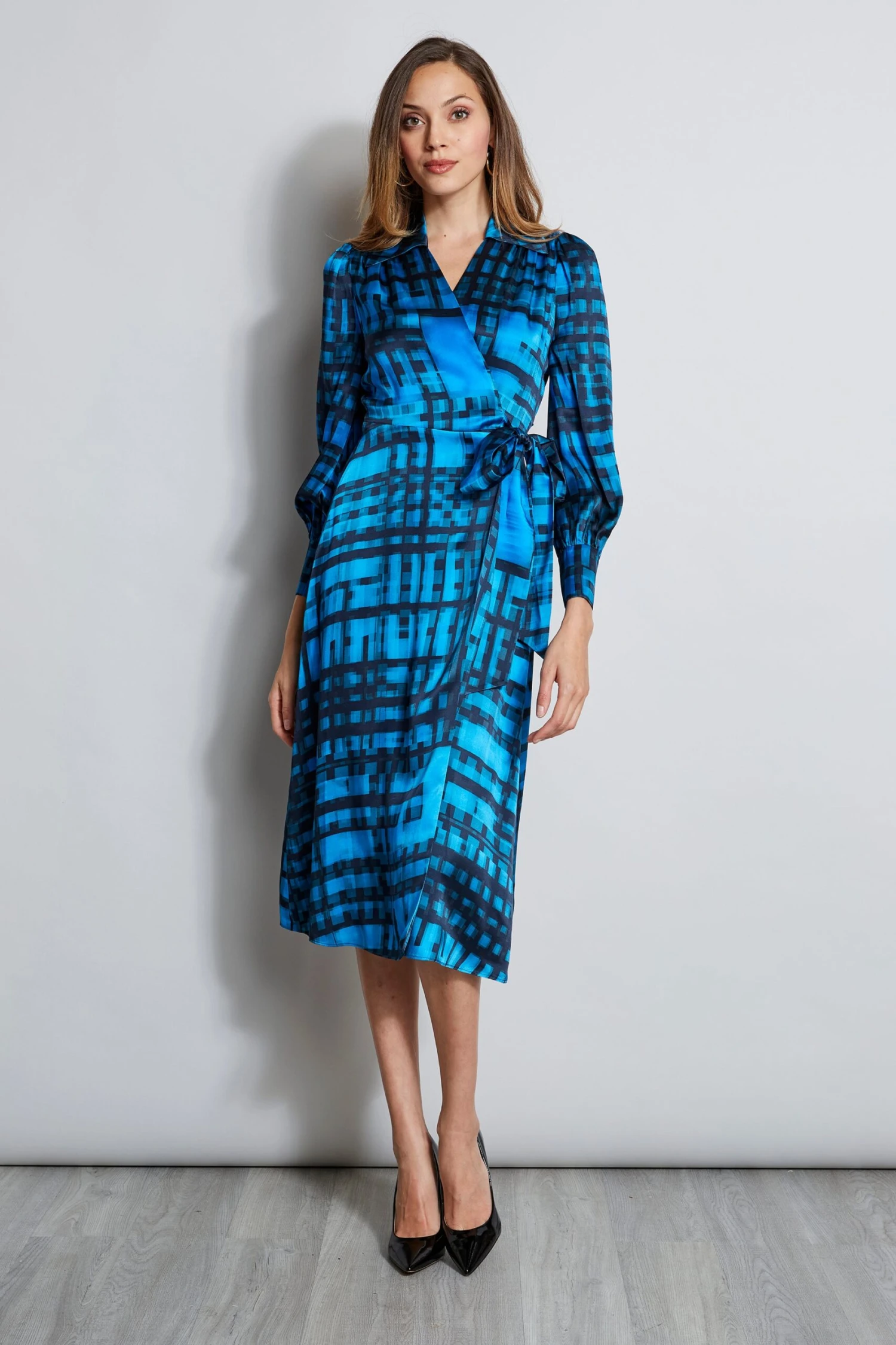 - Silk Satin Long Sleeve Cubist Plaid Print Wrap Dress