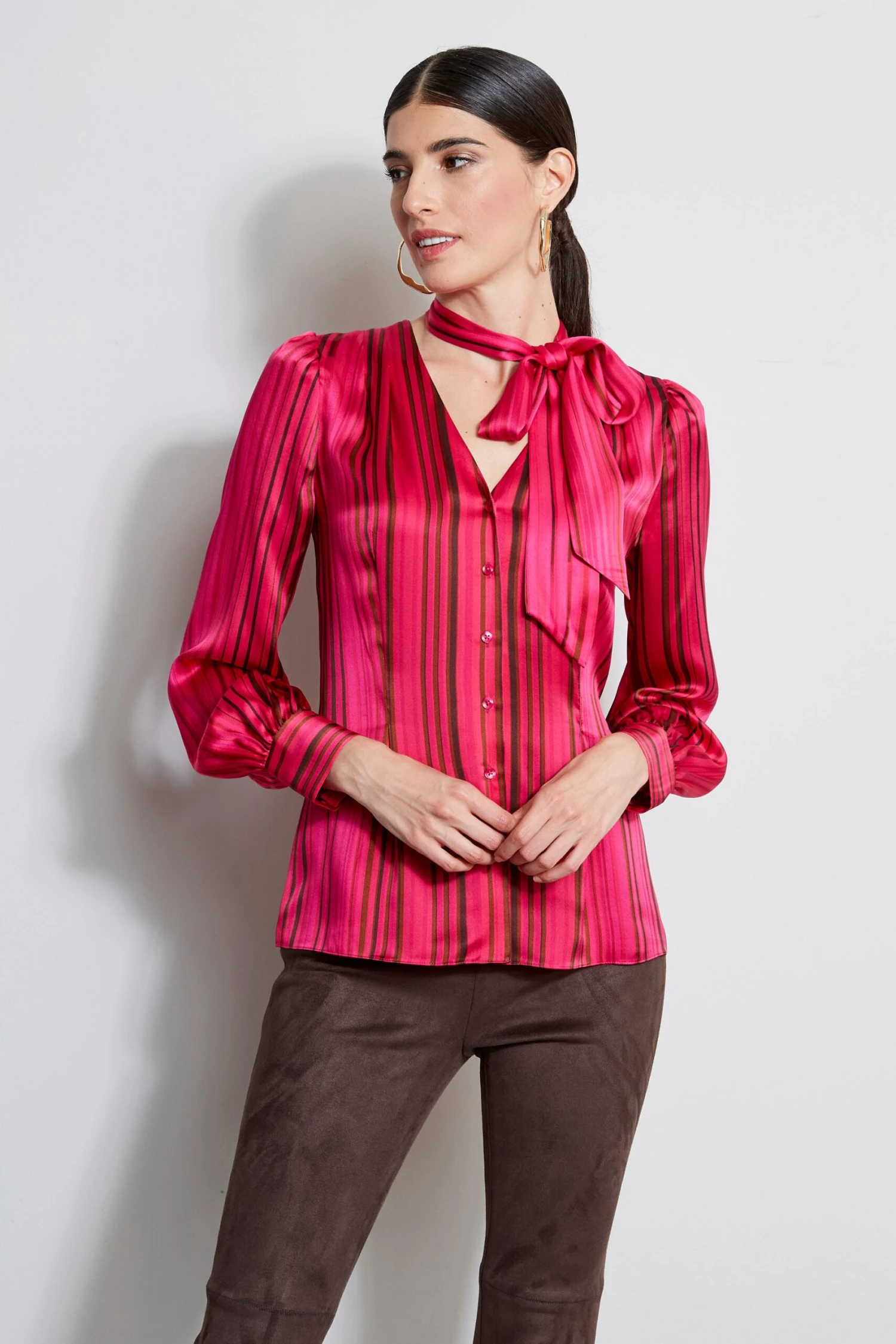 - Luxe Silk Satin Printed Stripe Shirt with Neck Tie & V-Neckline