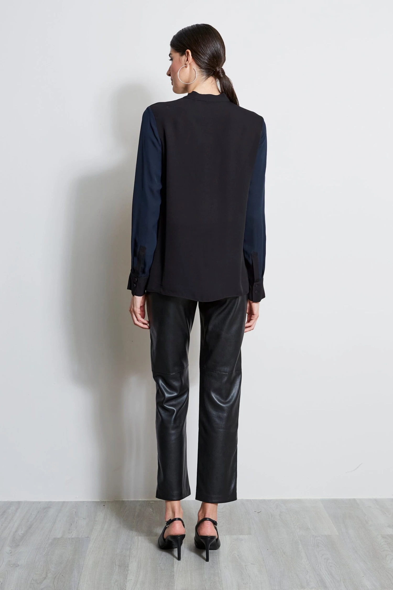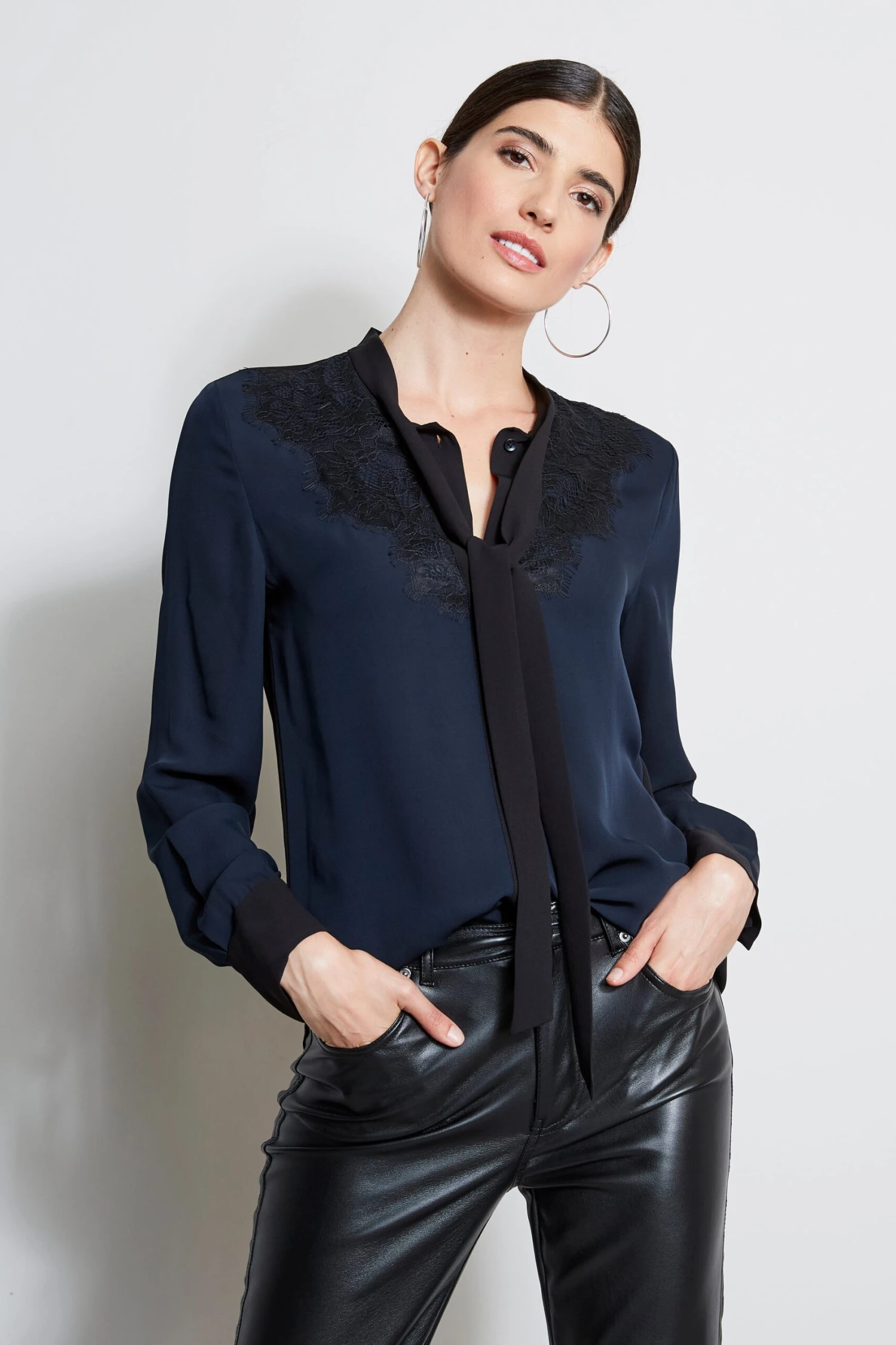 The Chantilly Lace applique on luxe Silk Georgette is a feminine redefinition of a shirt. Featuring a soft necktie and contrast color blocking, wear it layered under a blazer or pump up your style by wearing it on its own.
