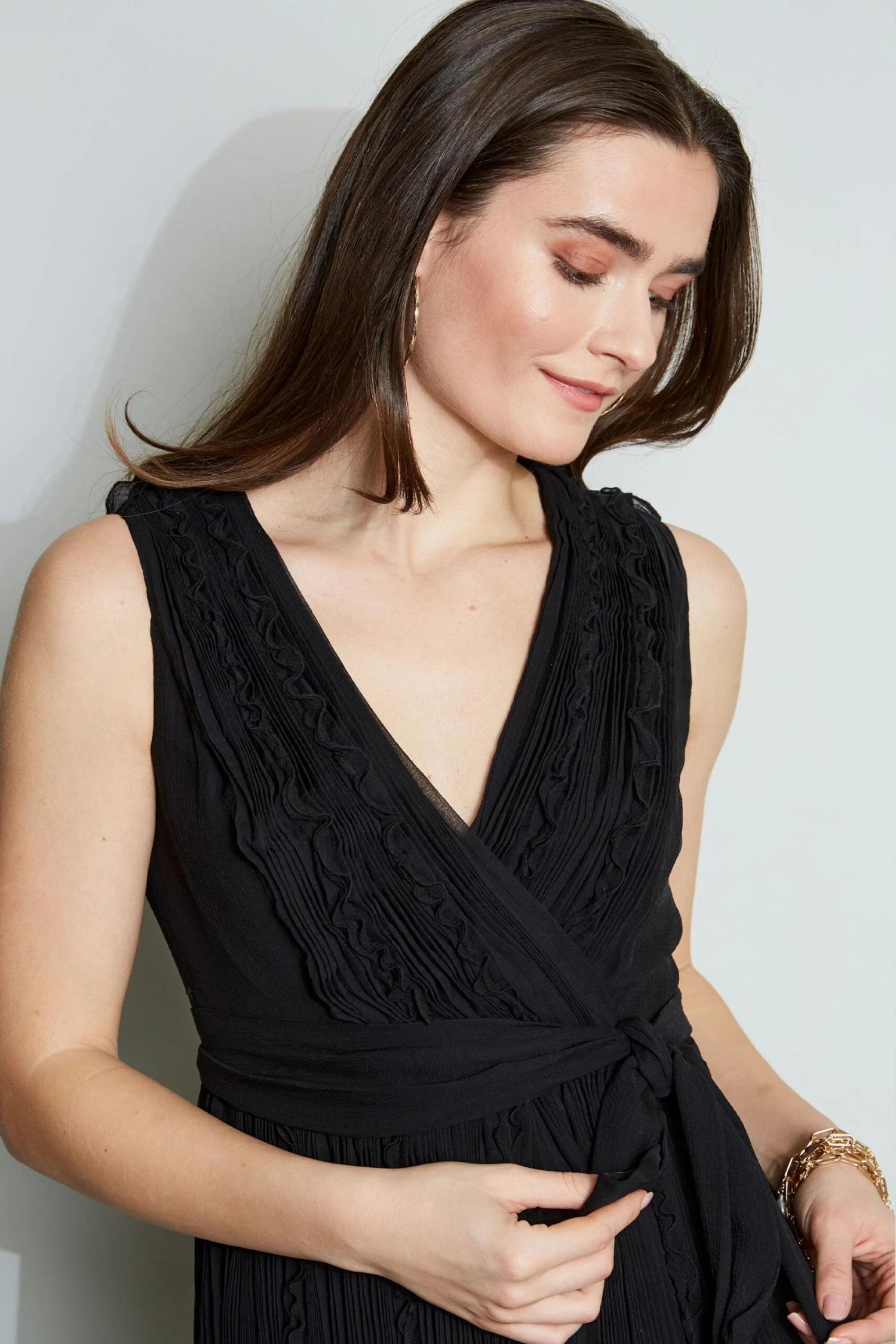 This delicate, breezy dress is the Little Black Dress your closet has been looking for. With a faux wrap top and cascading ruffles throughout, the Silk Crinkle Chiffon floats with movement as you walk, make a statement at your next occasion.