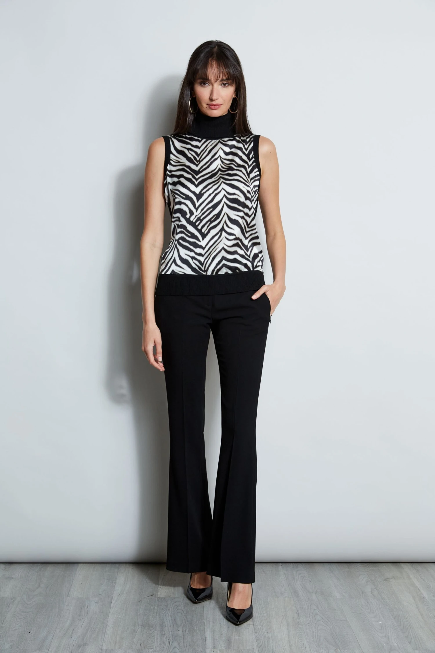 Our Zebra Print Silk Satin Front Turtleneck Sweater defines modern luxe dressing. The shimmer of Satin print adds texture & dimension to our sleeveless merino turtleneck Sweater. This piece will instantly elevate your cold-weather wardrobe, whether layered or worn on its own.