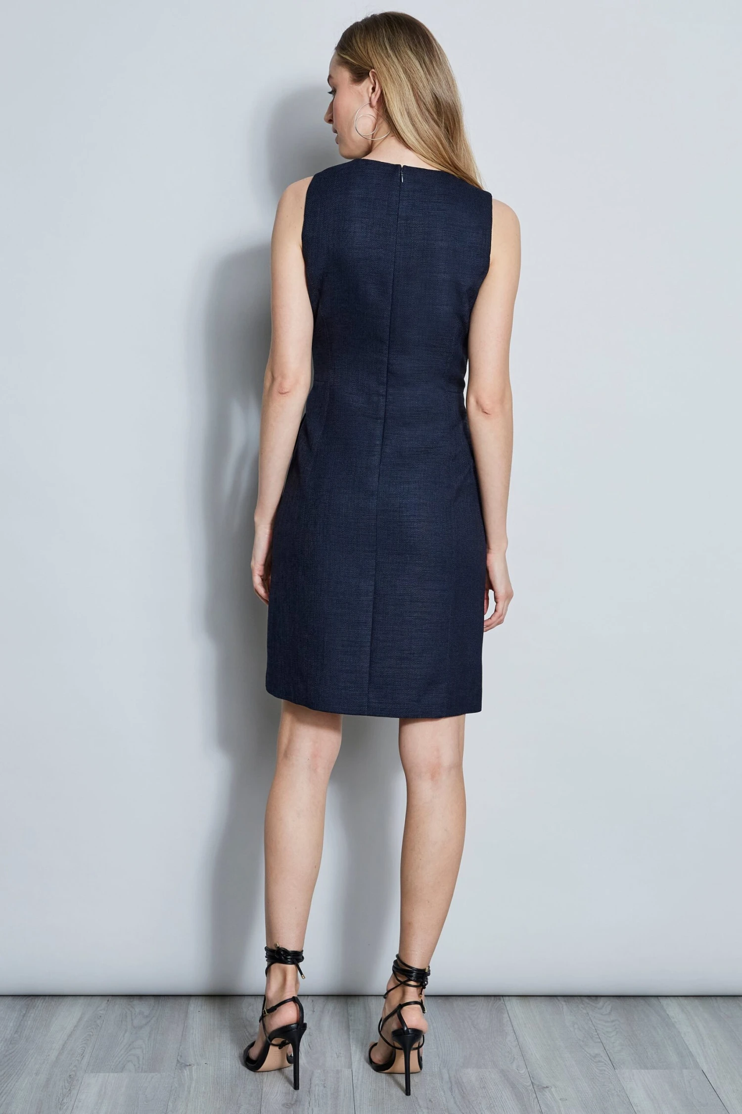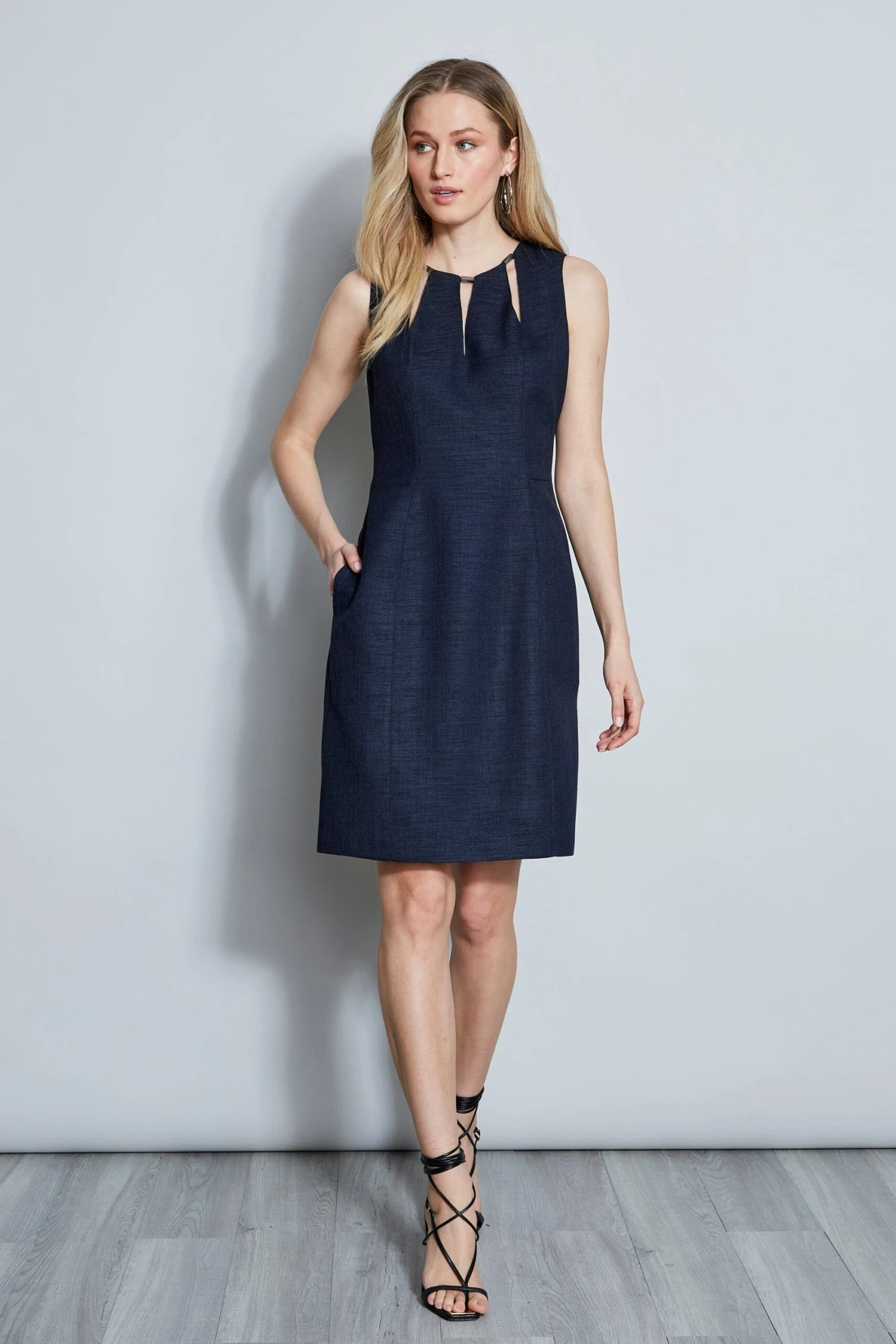 Modern architecture was the inspiration for our sleek basketweave dress. The slit cut-outs, metal bar detail and contour seaming give it a design edge – whether for day or a night out.