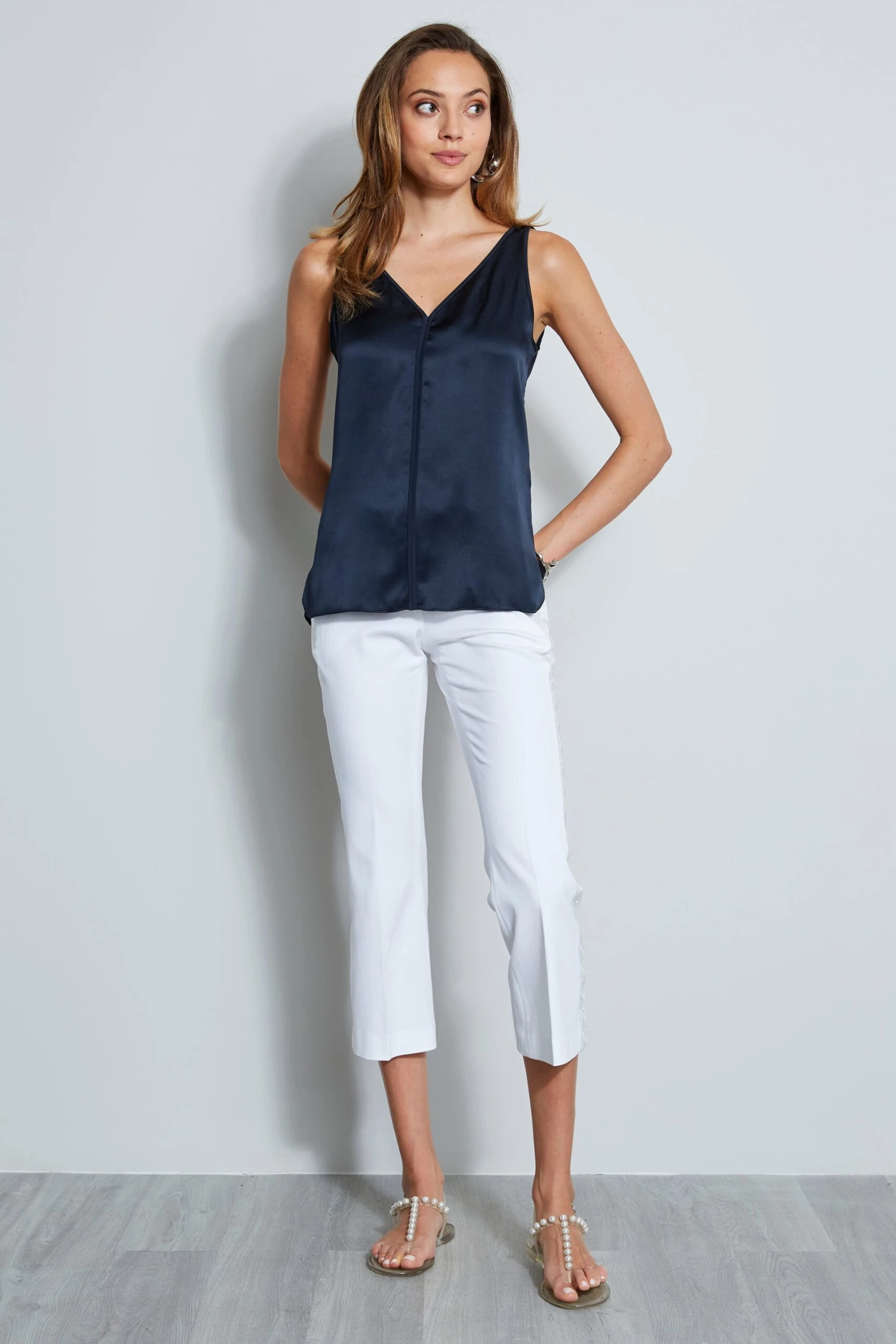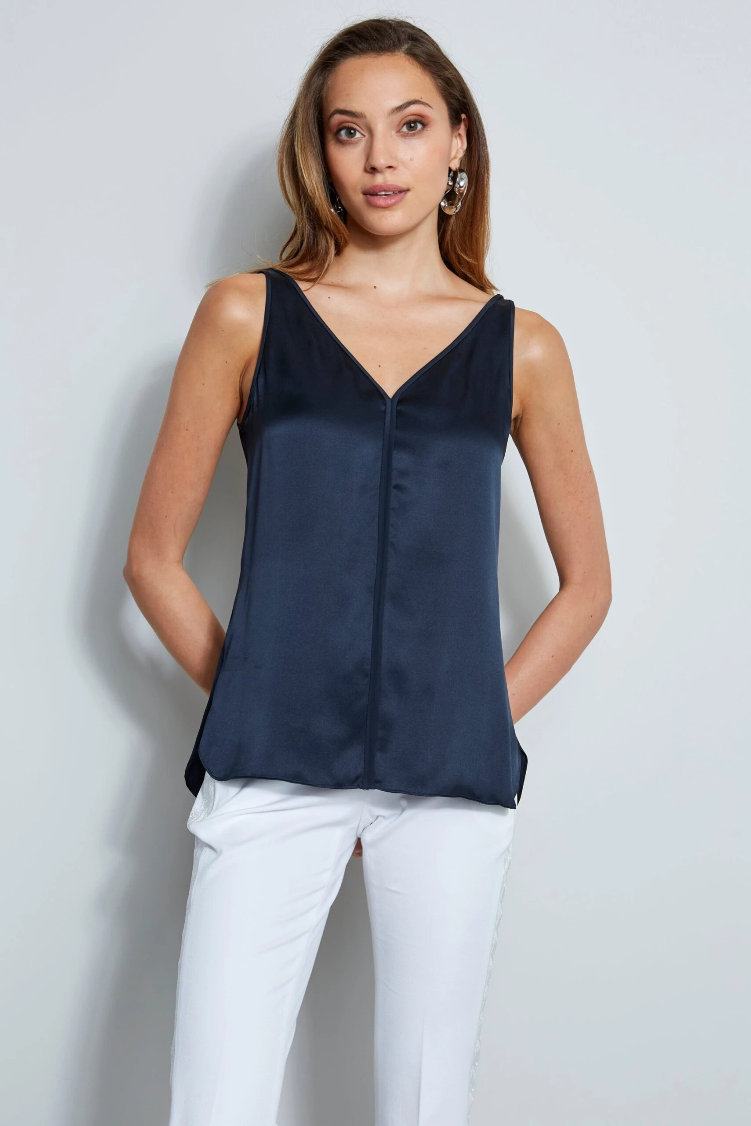 Done in our signature Silk Satin, the V-neck and piping detail lend a chic factor to this timeless top. Dress it down with white denim or up with a midi skirt & sexy sandals.Â