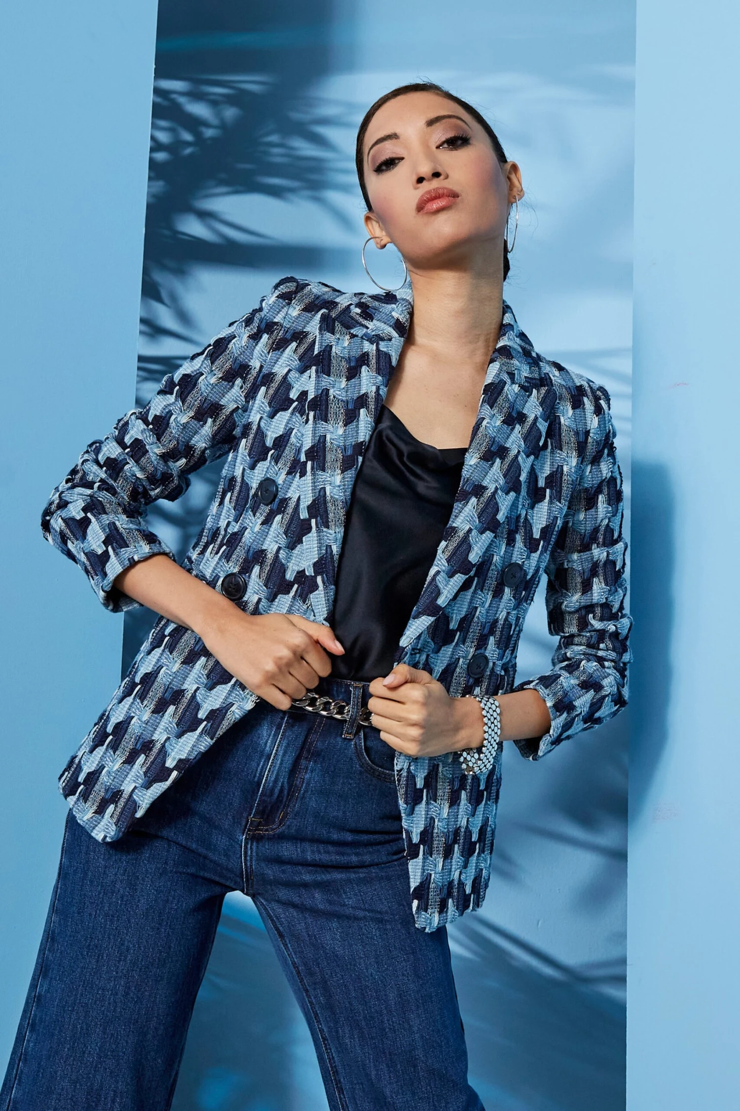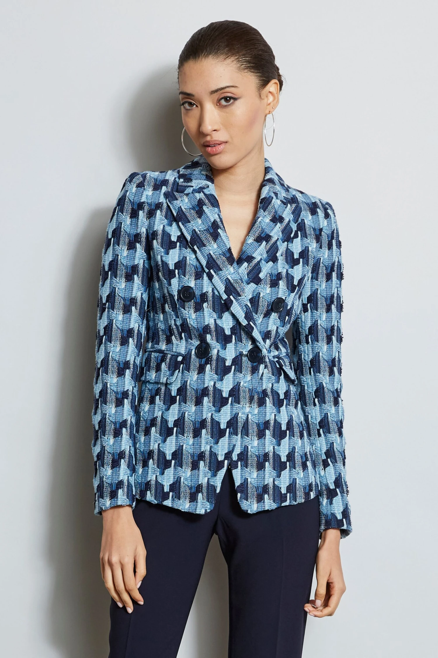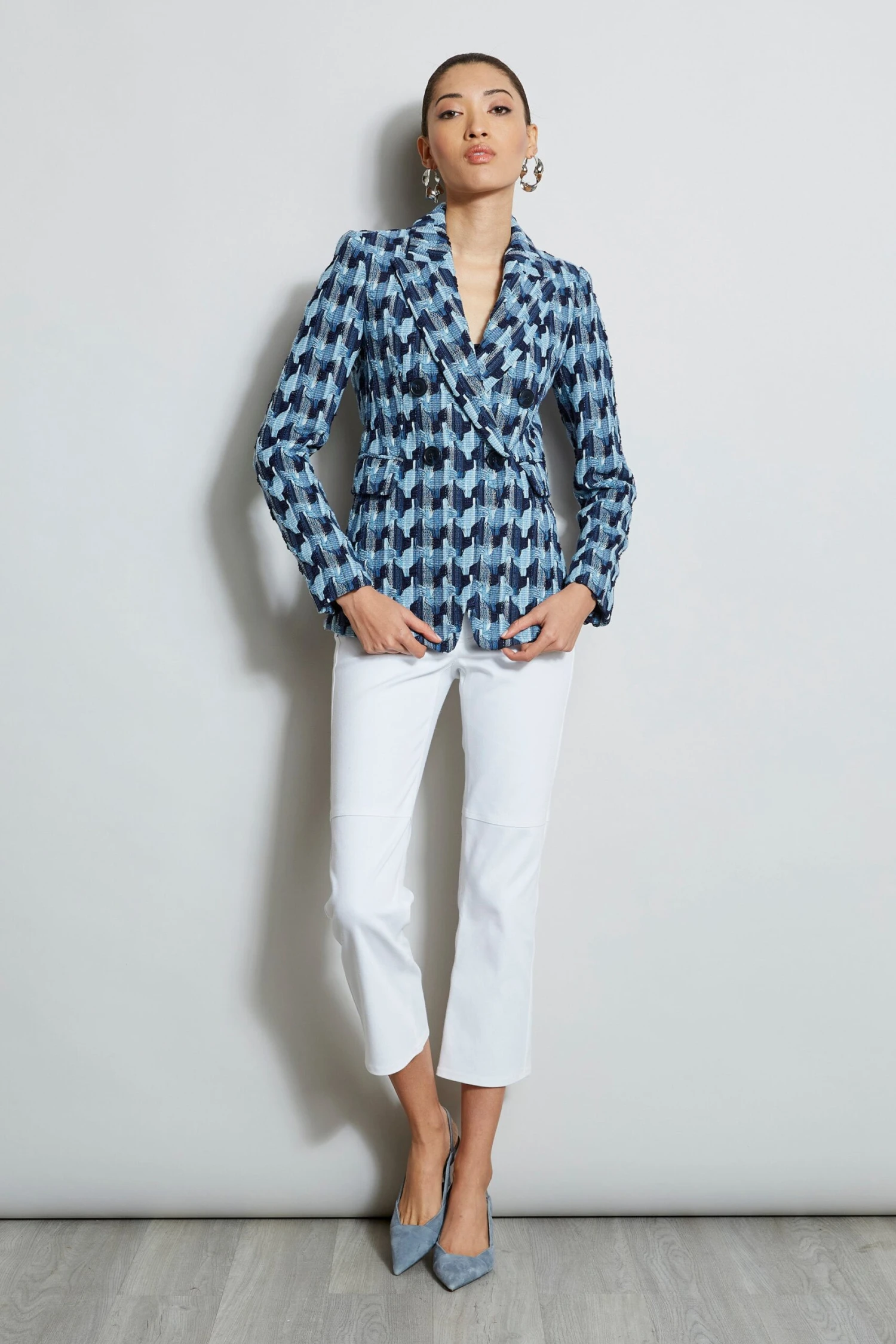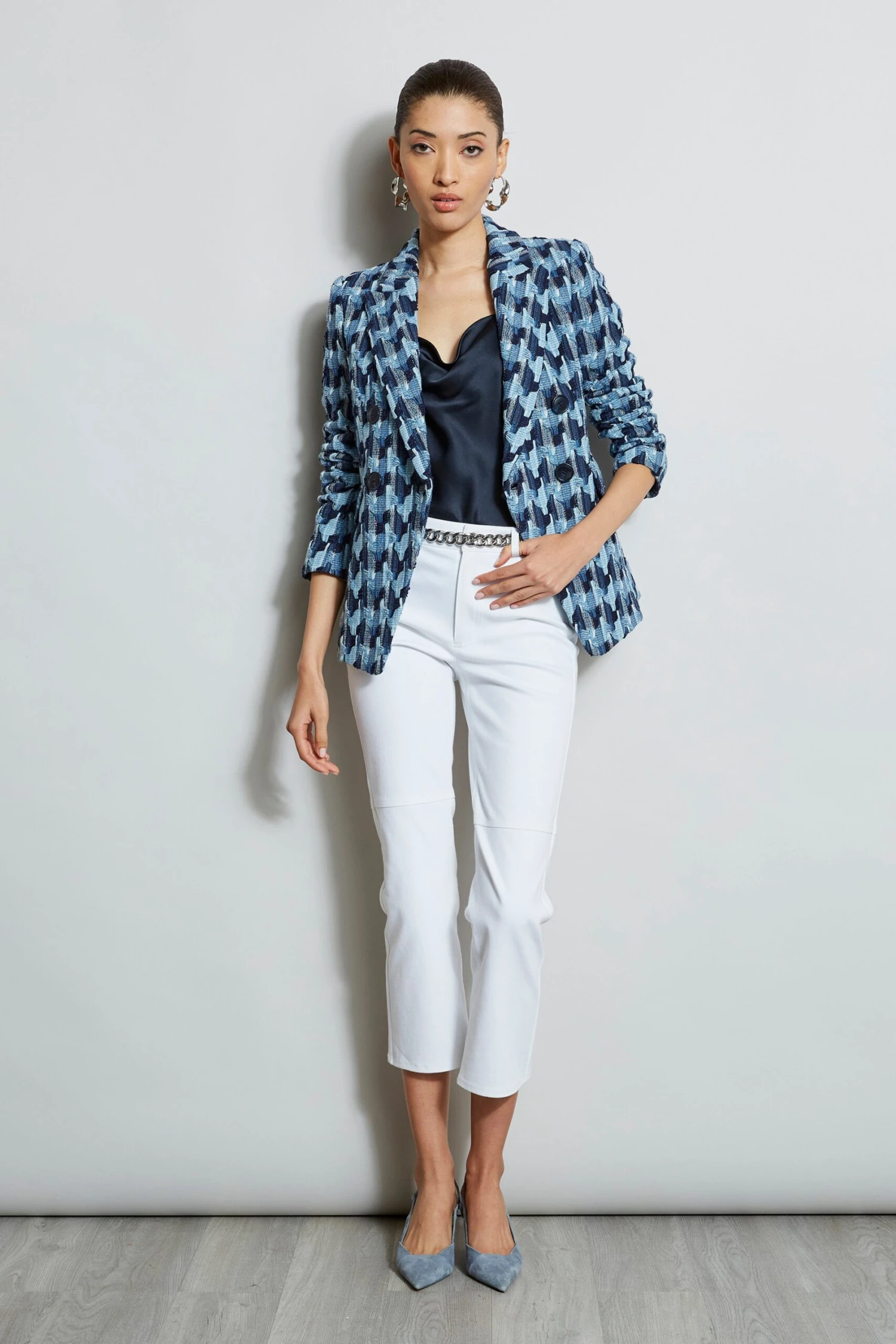 Elie chose a sophisticated Italian Twisted Tweed for his signature Double Breasted Jacket. With colors inspired by denim and the sea, it’s perfect for pairing with our white or denim jeans and our navy crepe pants.