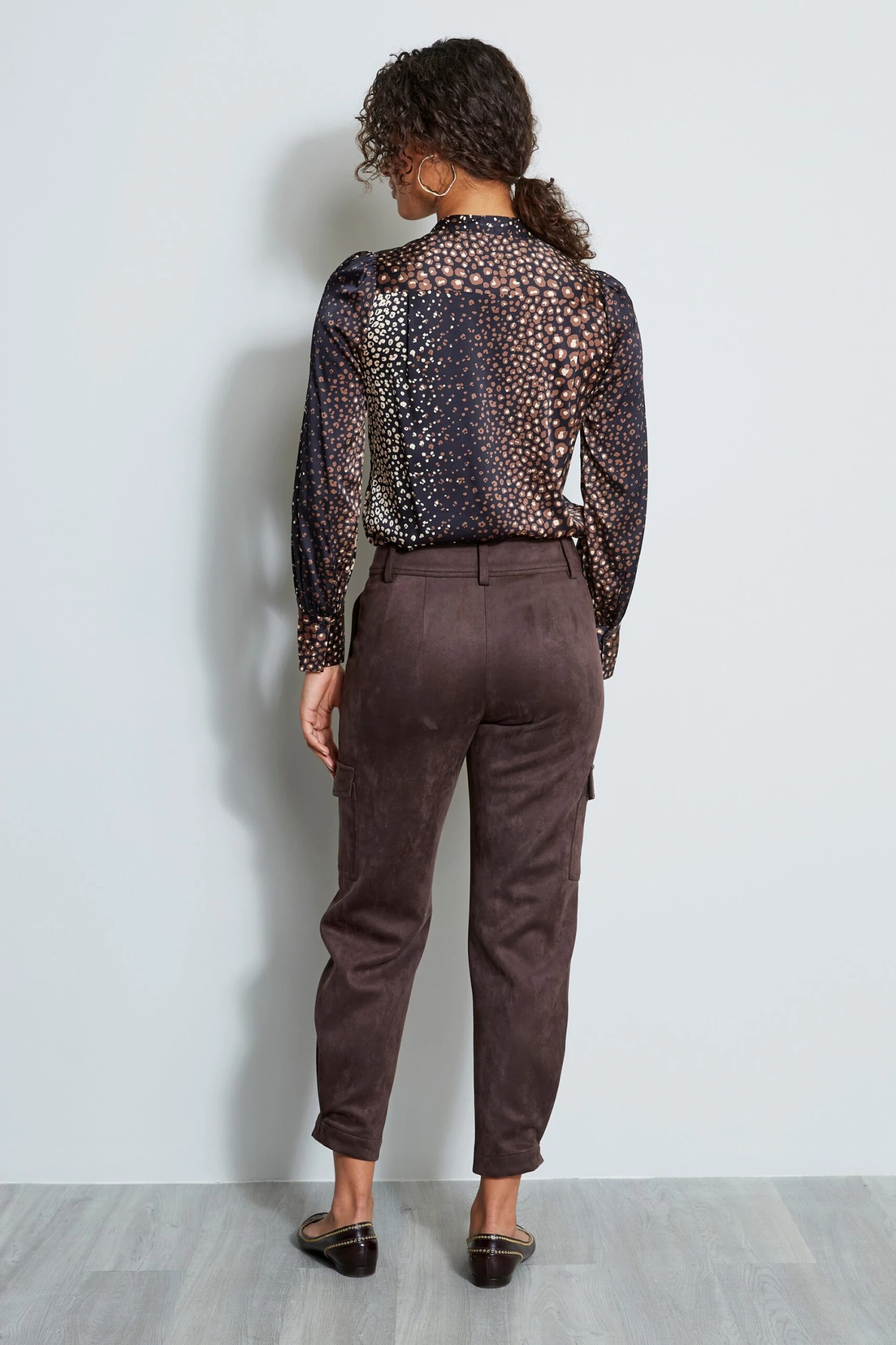 Our Vegan Suede Cargo Pant is Elie’s take on the Season’s must have utilitarian trend. Sporty & cool, it’s detailed with cargo pockets & pleat hem detail. Done in luxe Vegan Suede, you will live in these pants all season long.