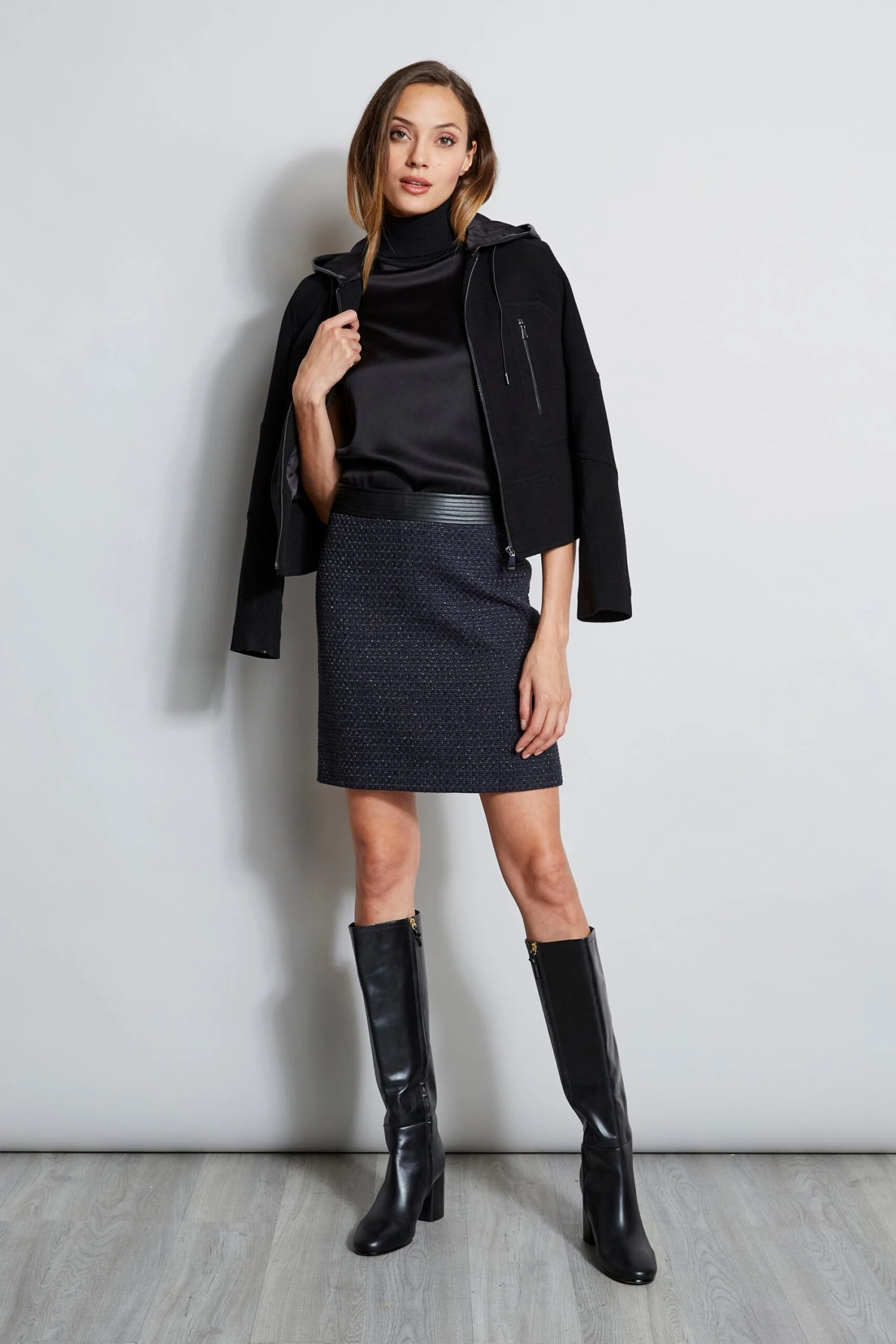 Our metallic kissed Tweed Skirt is accented with a vegan Leather waist yoke. Pair it with its matching Tweed Jacket or with our Cashmere Turtleneck or Satin Front Merino Sweater.