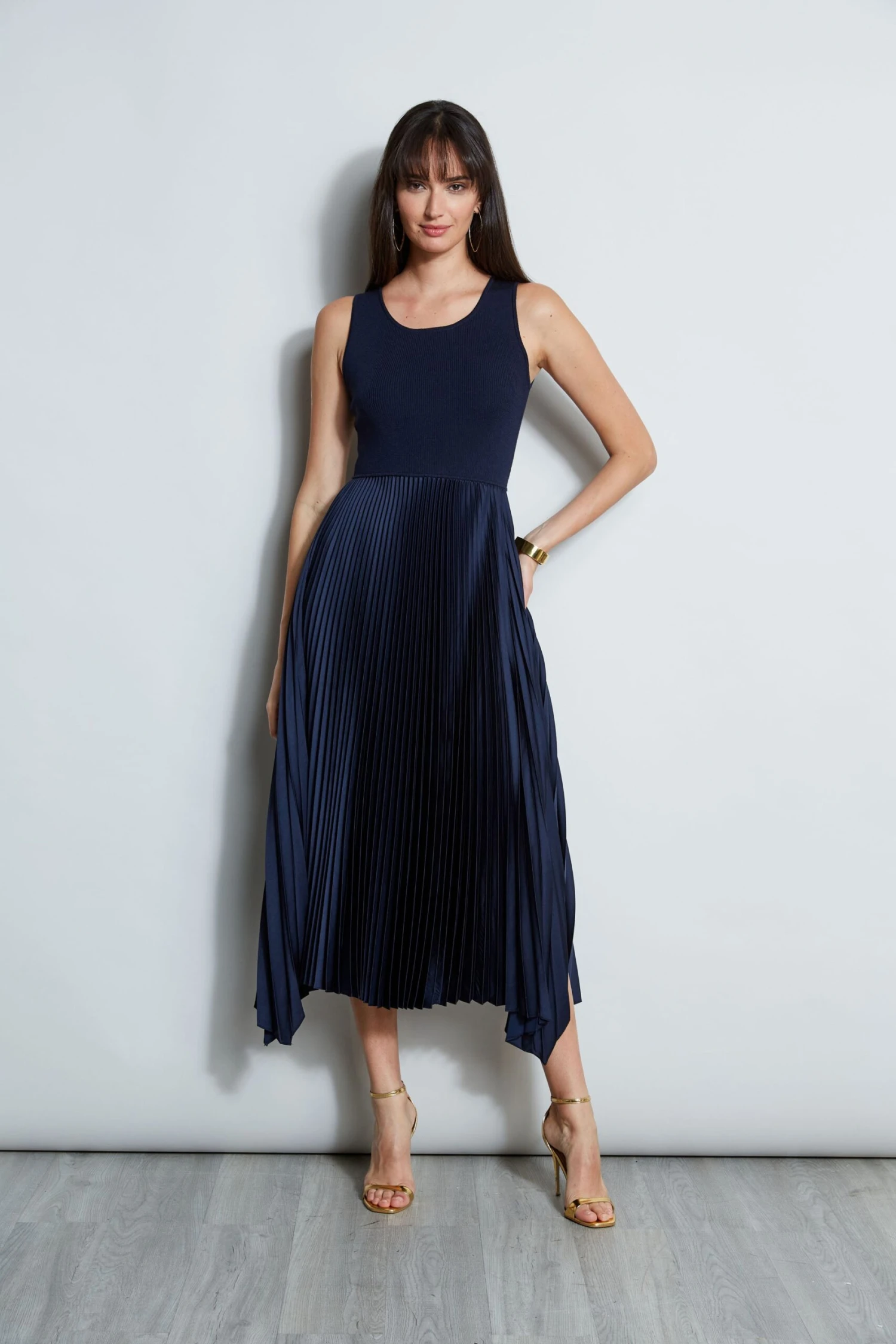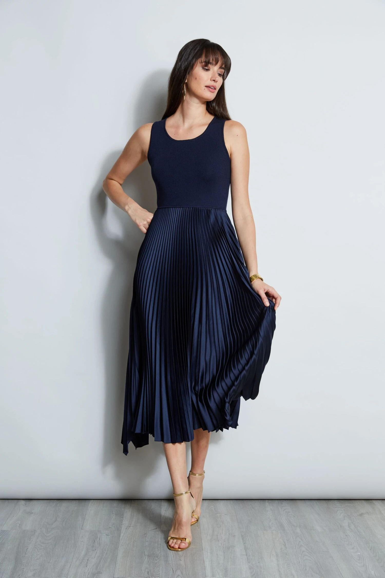 - Mixed Media Pleated Midi Dress with Ribbed Knit Bodice