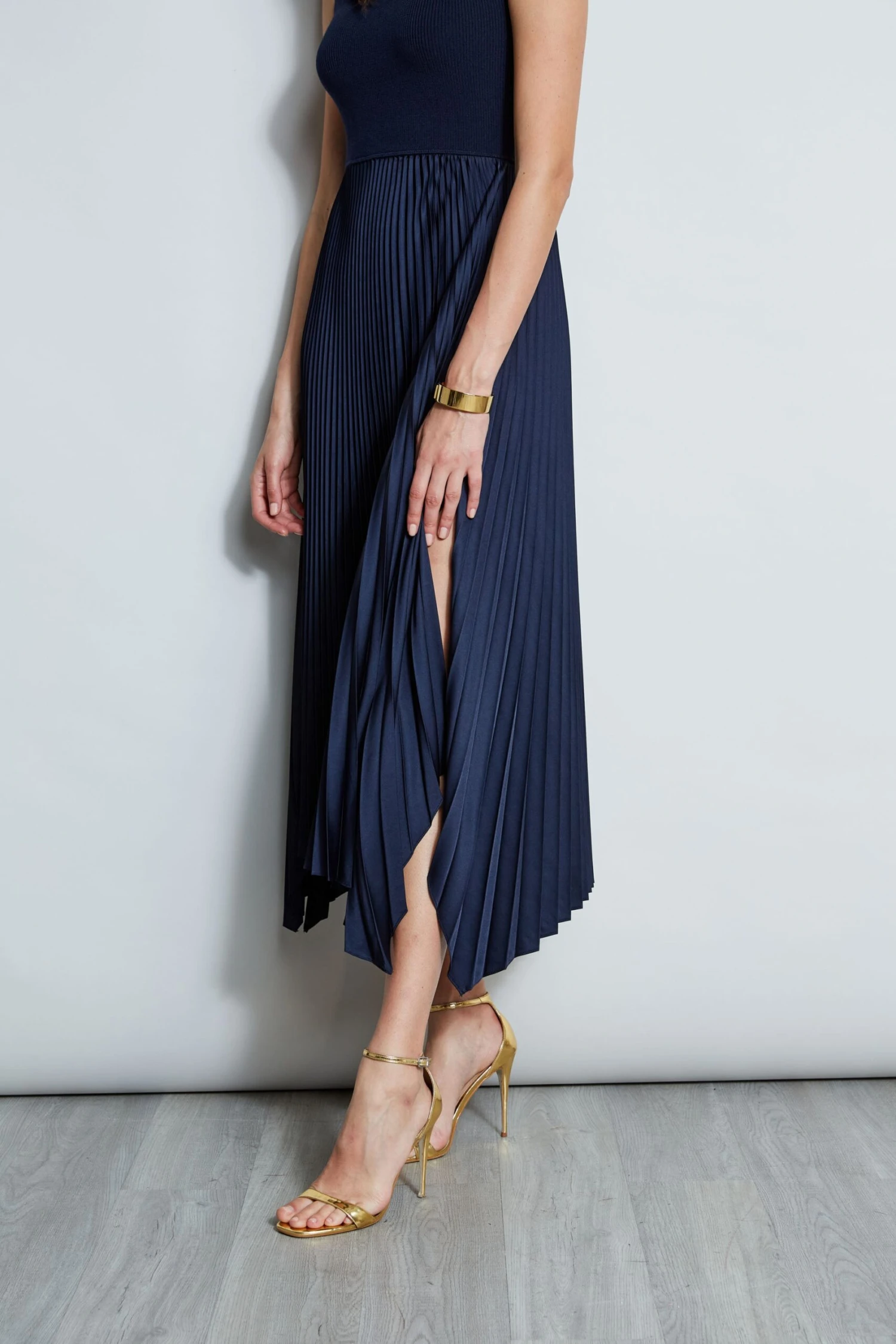 Designed with a ribbed Viscose knit bodice, this effortless midi dress is elevated with a dramatic sunburst pleated asymmetrical hem skirt. The effortless dress will easily transition into fall, and from day to night.
