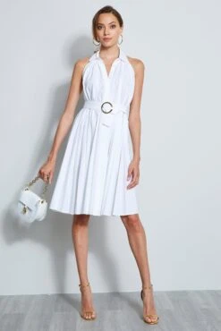 The easiest of Summer shirtdresses is elevated with accordion pleasing that begins at the halter neckline and extends to the hem. Cinch the waist with its self sash belt with gold hardware. In a lightweight cotton poplin blend, this is a statement piece.
