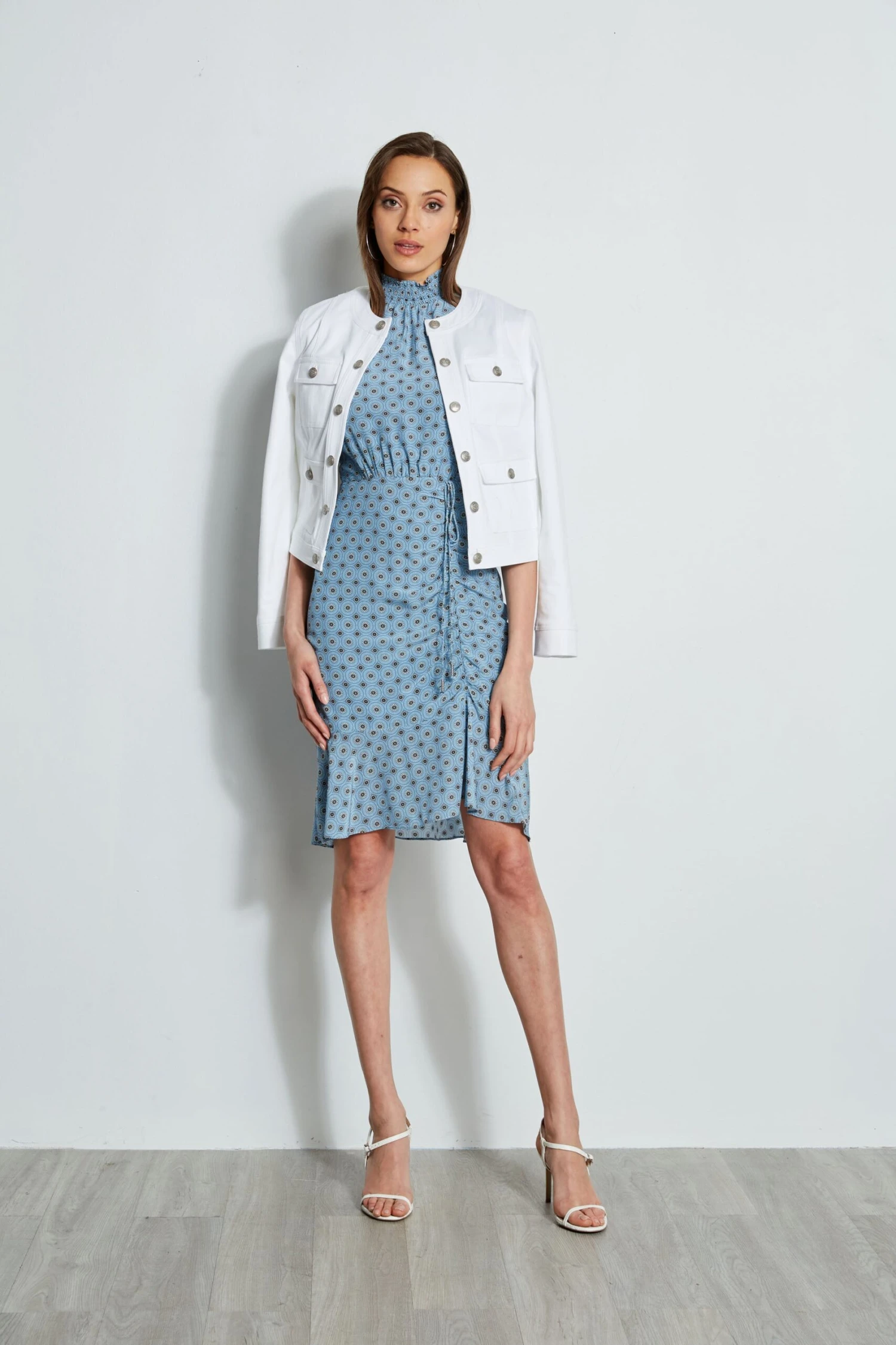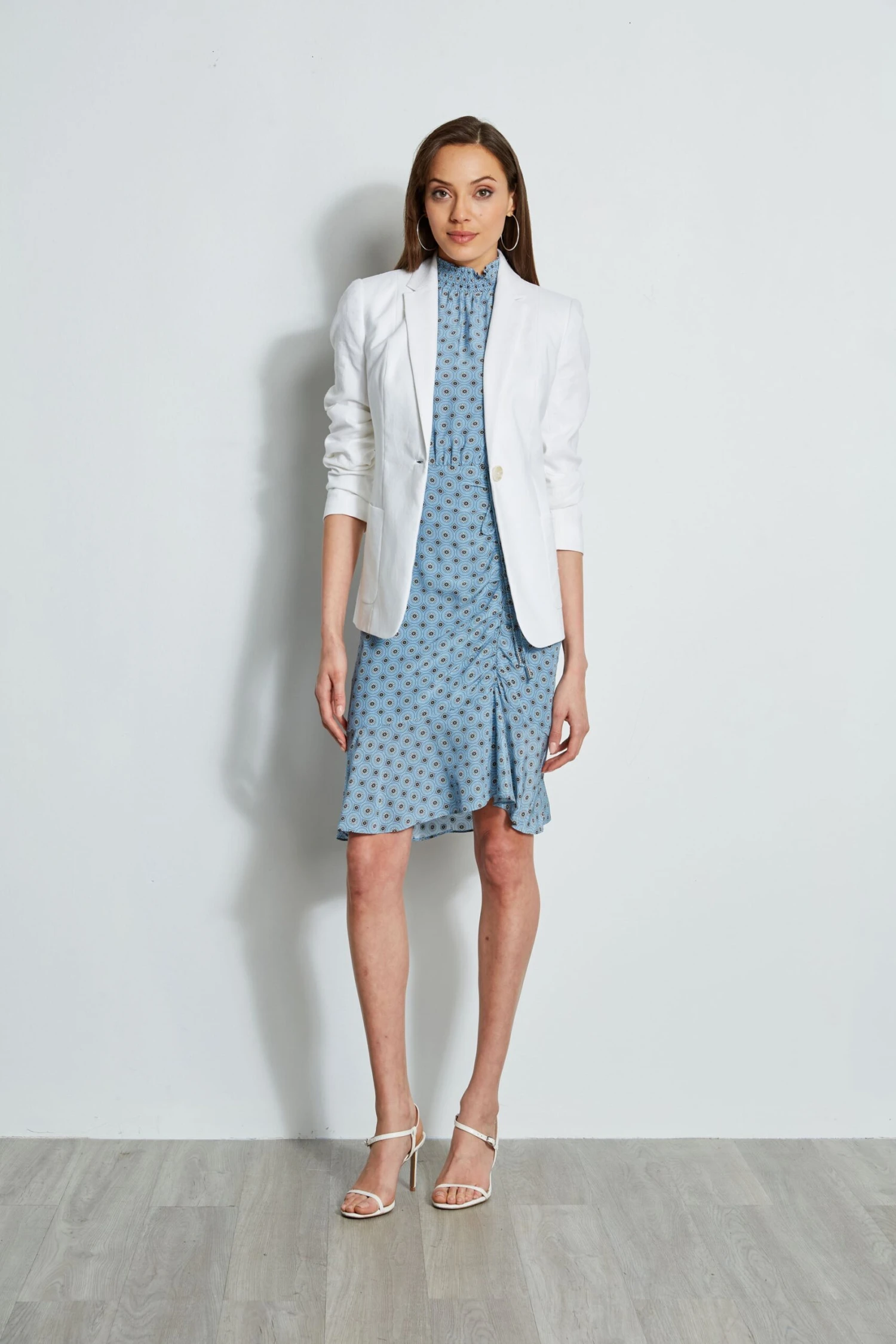 Our Printed Silk Dress has a soft, modern vibe. The smocked neckline, flutter sleeves and ruched flounced skirt lend a feminine twist to the modern geometric print. This dress will work overtime in your closet – whether it’s day to night, a special occasion or layered with a blazer.