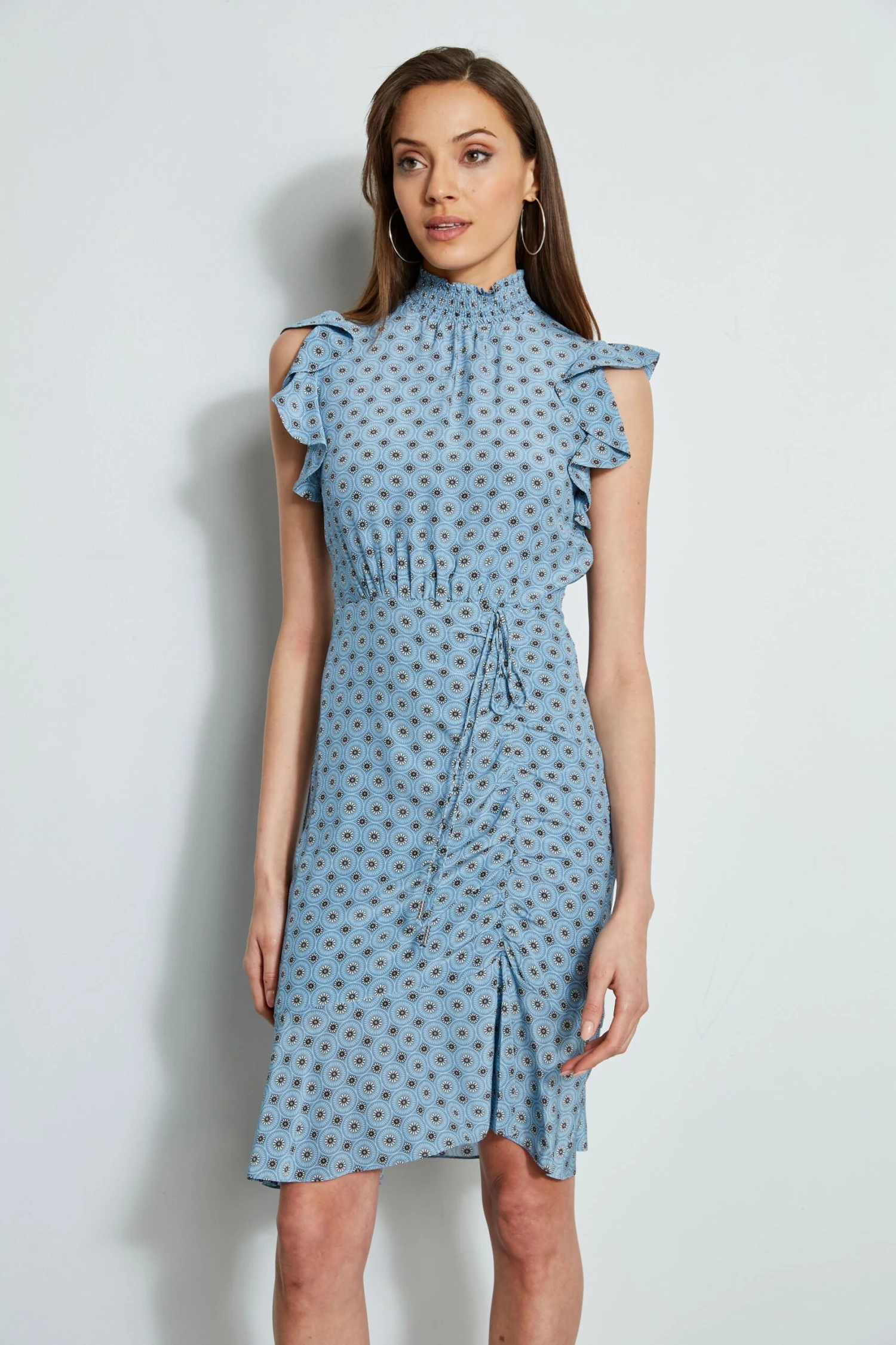 - Silk Geometric Sun Print Short Dress with Ruching & Flutter Sleeves