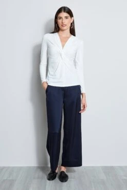 - Long Sleeve Silk Satin Blouse with a Twist Neck & Pearl Detailing