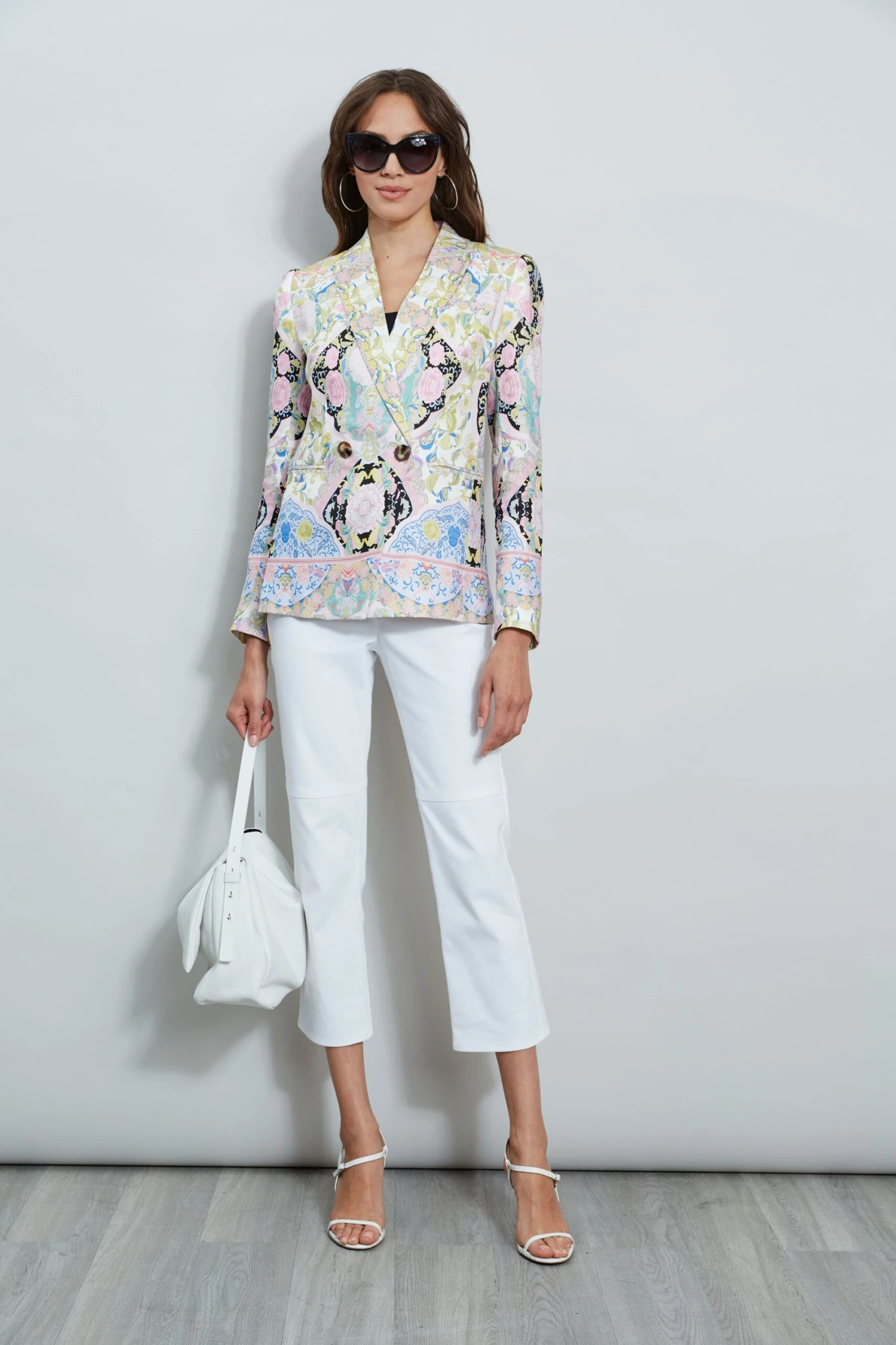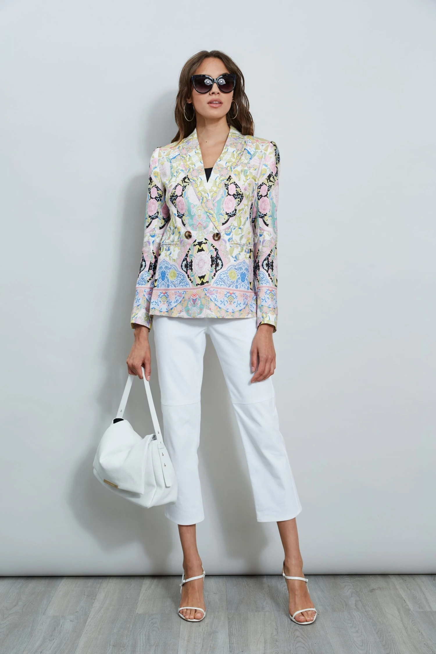 The Double Breasted Blazer is reimagined in a sophisticated Summer Damask print with tortoise button. Wear it casually with jeans or flats or pair it with its matching pant for a cool take on the suit.